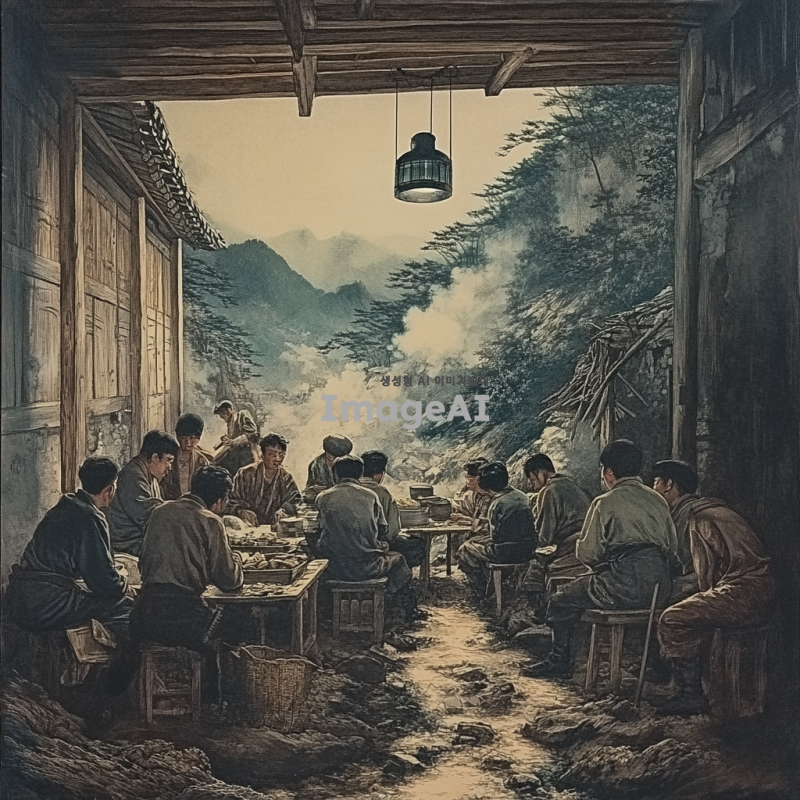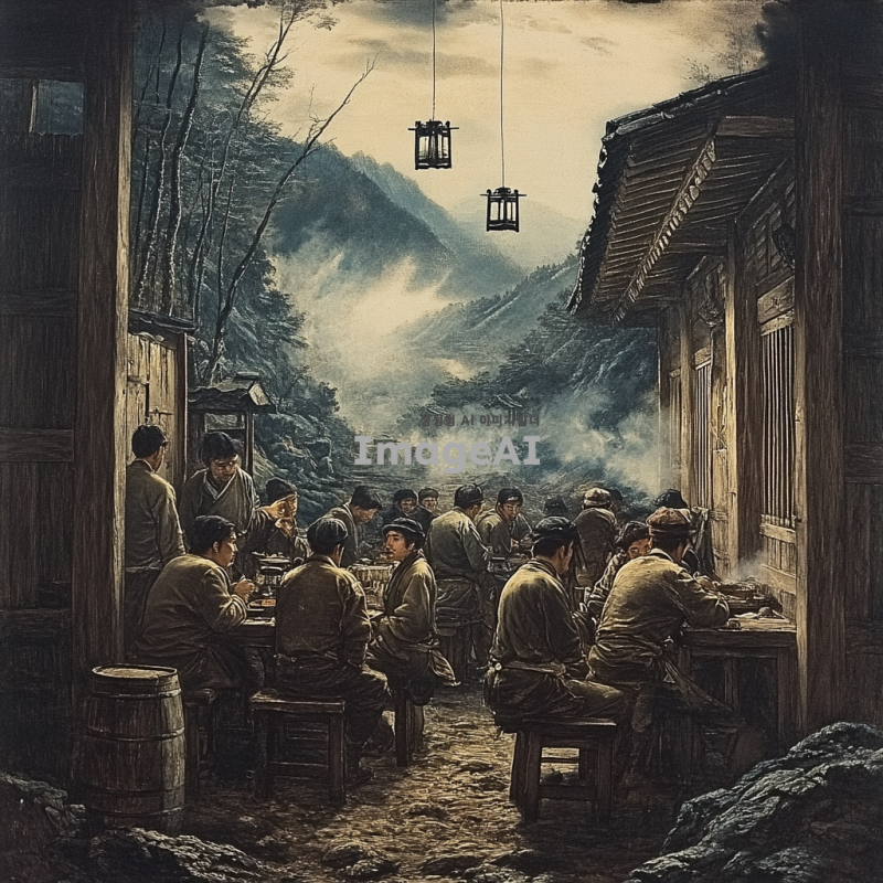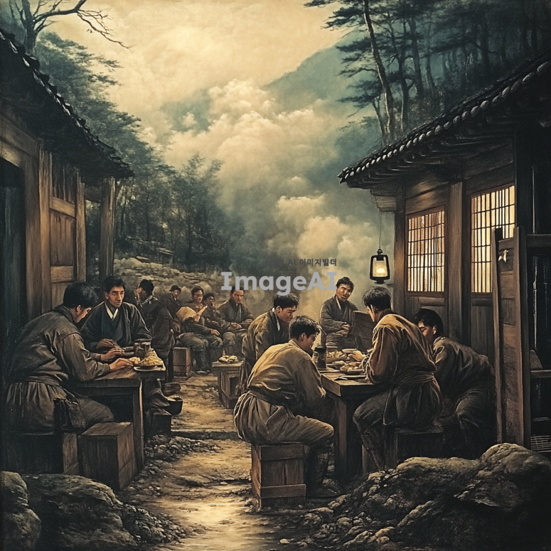 조선시대 주막의 내부, 좁고 허름한 공간에서 약 20명의 조선인들이 모여 있는 장면. 사람들은 낡은 옷을 입고 있으며, 일부는 앉아서 대화를 나누고 있고, 다른 이들은 작은 식탁에서 간단한 음식을 먹고 있다. 주막의 벽은 나무로 되어 있으며, 창문으로는 희미한 빛이 들어오고 있다. 바닥은 흙으로 되어 있고, 천장에는 그을음이 낀 등불이 걸려 있다. 전체적으로 어두운 분위기와 함께 사람들의 얼굴에는 피로한 표정이 서려 있다.