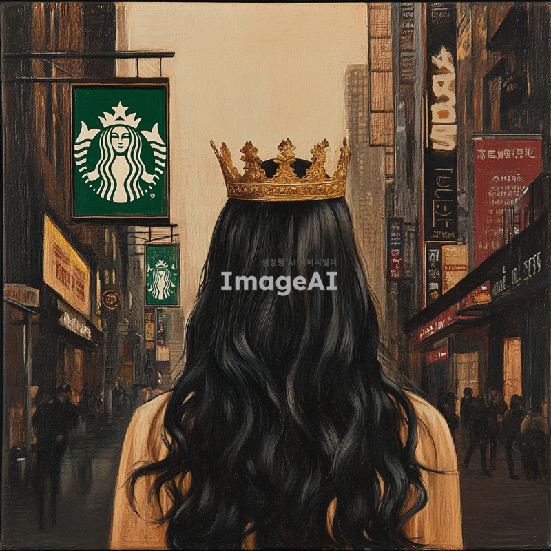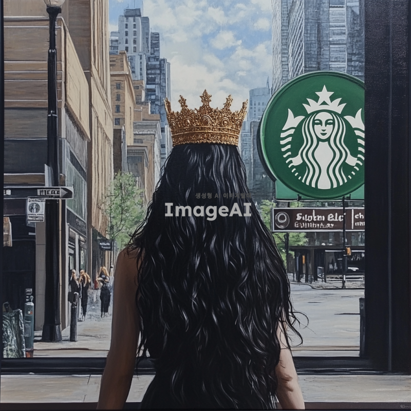 스타벅스로 들어가고 있는 예수, 긴 검은 머리를 가진 그녀는 화려한 왕관을 쓰고 있으며, 주변은 현대의 도시 모습, . 예수의 뒷모습이 보이고 스타벅스의 간판이 보인다.