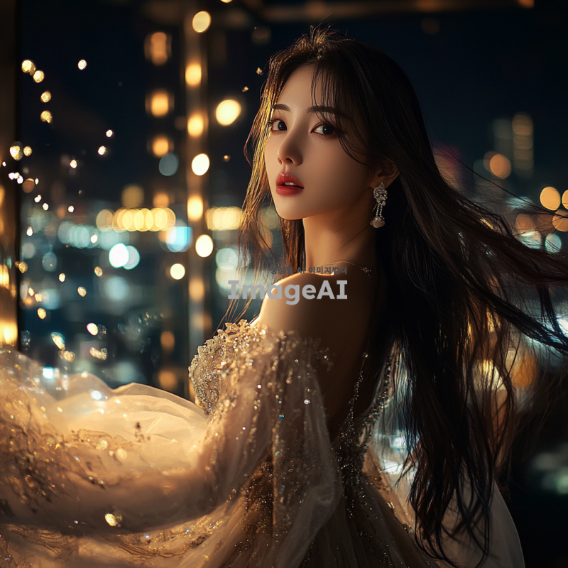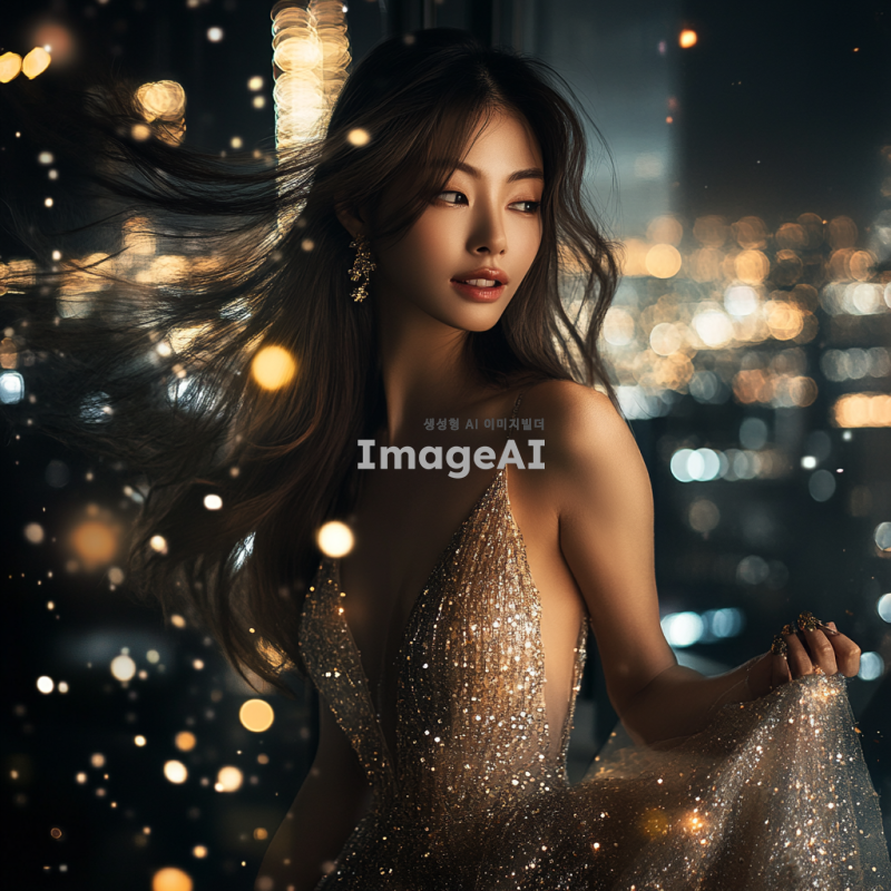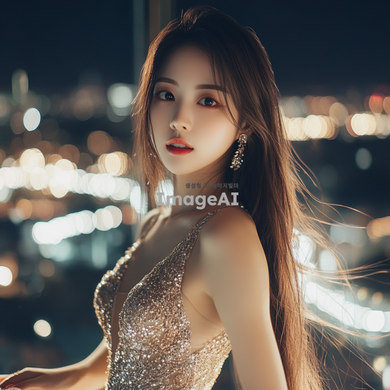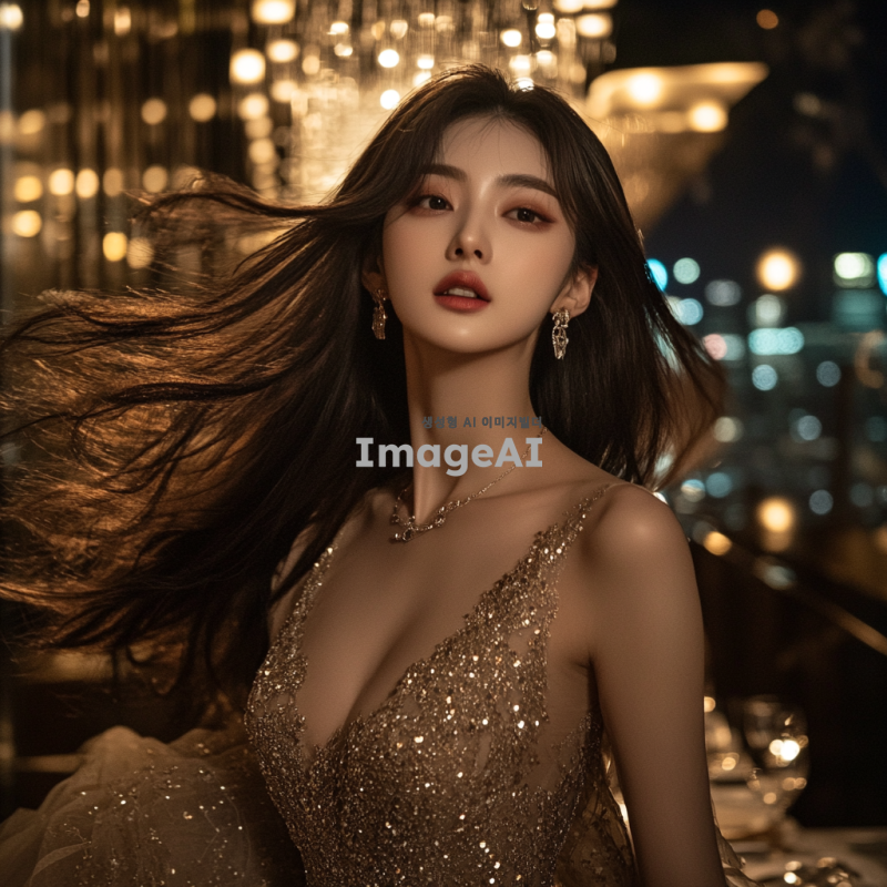 매혹적이고 세련된 분위기의 한국인 여성, 고급스러운 드레스를 입고 있으며, 긴 머리가 바람에 흩날리는 모습, 도심의 야경을 배경으로 한 화려한 파티 장소에서 우아하게 포즈를 취하고 있는 장면, 부드러운 조명과 반짝이는 액세서리로 강조된 스타일리시한 이미지.