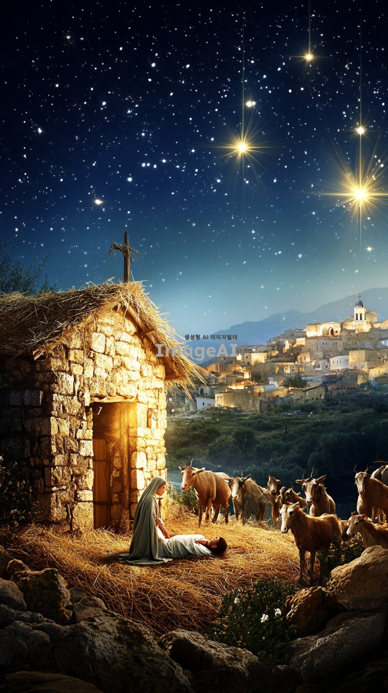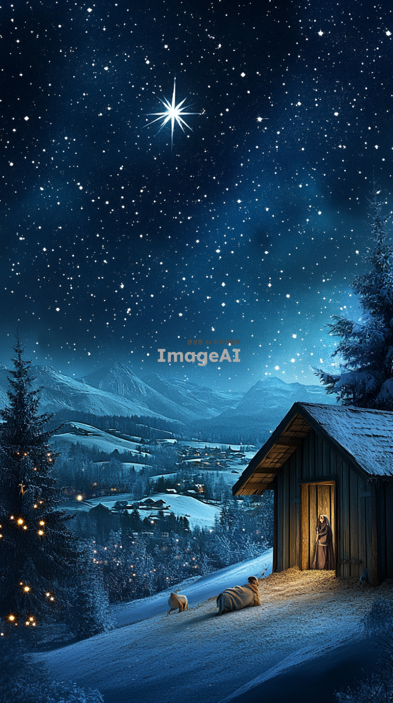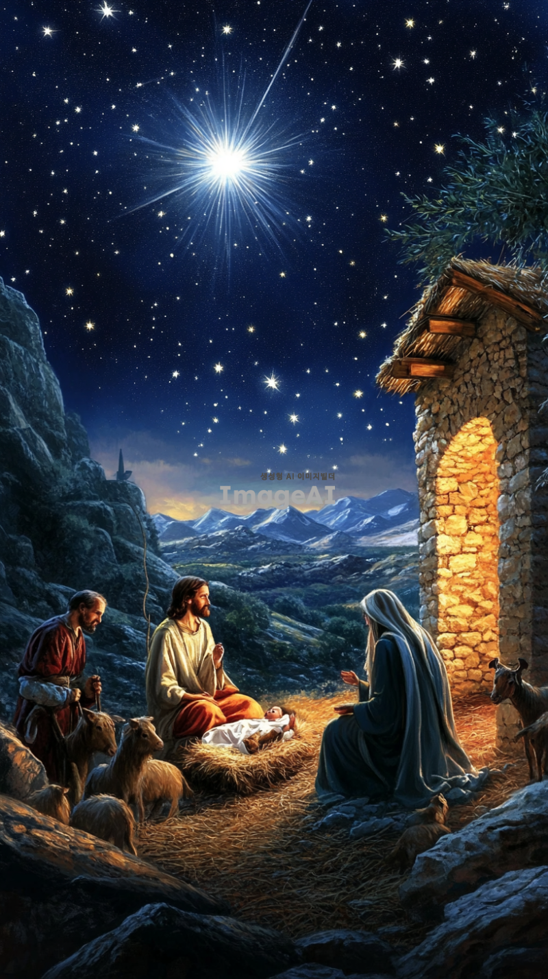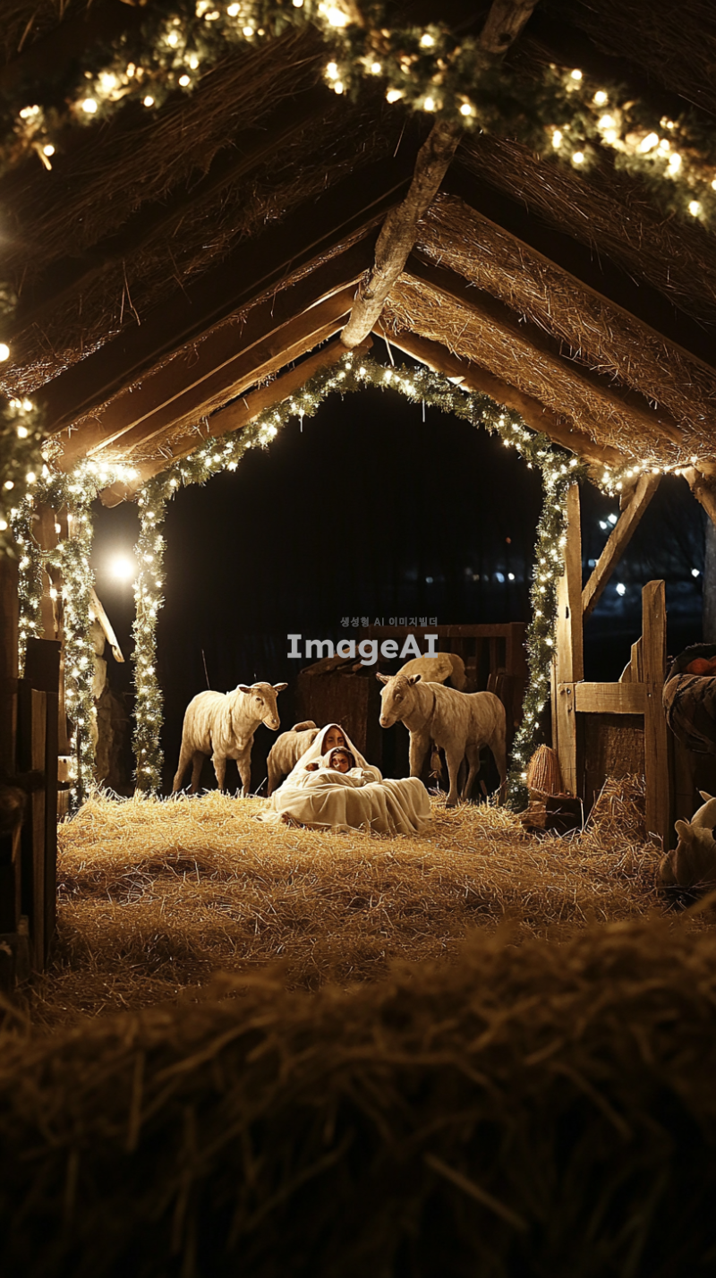 겨울밤 예수의 탄생이 되었던 마굿간 목자도 지켜보고 천사도 있다. 마리아도 있음