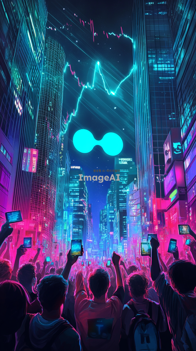 리플 코인의 로고를 중앙에 아주 크게 배치하고, 그 주위로 리플코인의 급상승을 기뻐하는 사람들로 둘러싸인 장면. 사람들은 환호하며 스마트폰을 들고 코인의 상승 그래프를 보고 있다. 배경은 현대적인 도시의 금융가로 설정하여 성공과 번영의 이미지를 강조. 밝고 활기찬 분위기의 색상과 조명을 사용하여 긍정적인 느낌을 전달.