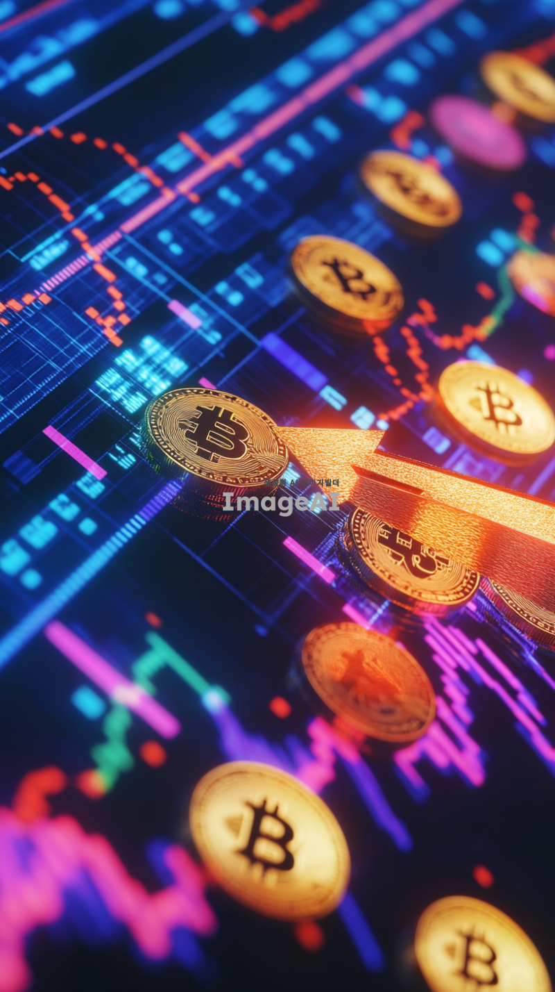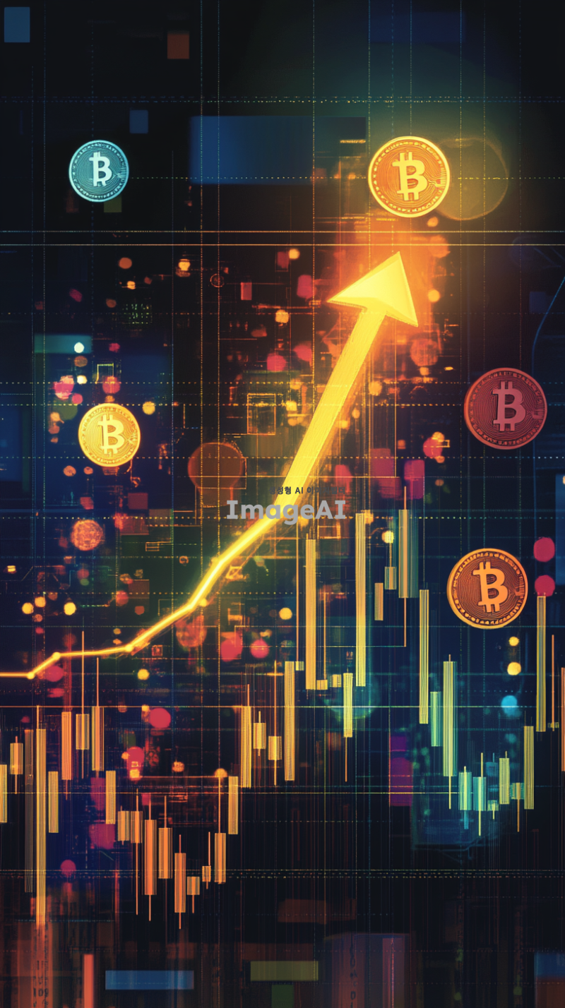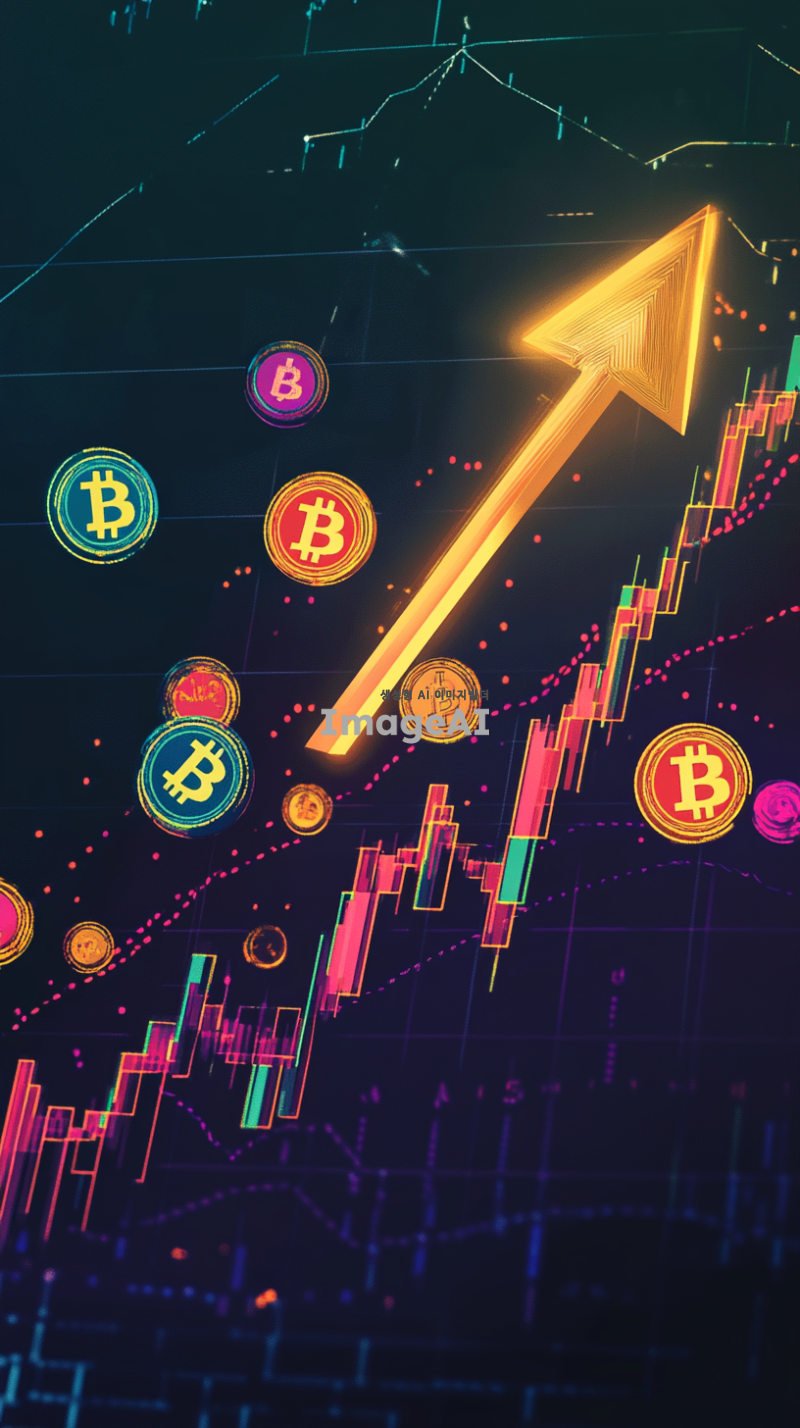 암호화폐가 급등하는 모습을 표현한 그래프, 차트 배경에 빛나는 금색 화살표가 위로 향하며 상승하는 모습, 다채로운 색상의 코인 아이콘들이 그래프 주변에 흩어져 있는 모습, 경제적 성장과 성공을 상징하는 이미지.