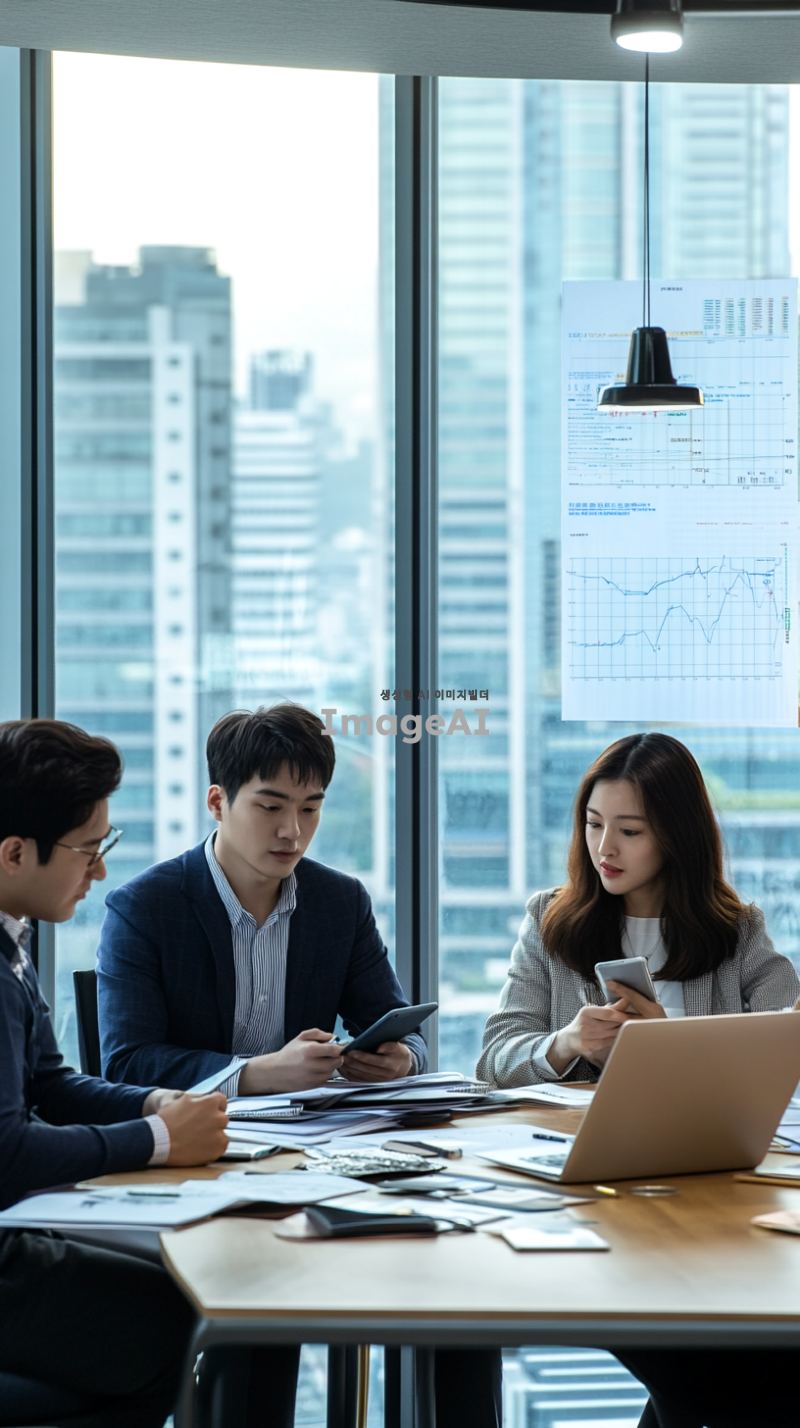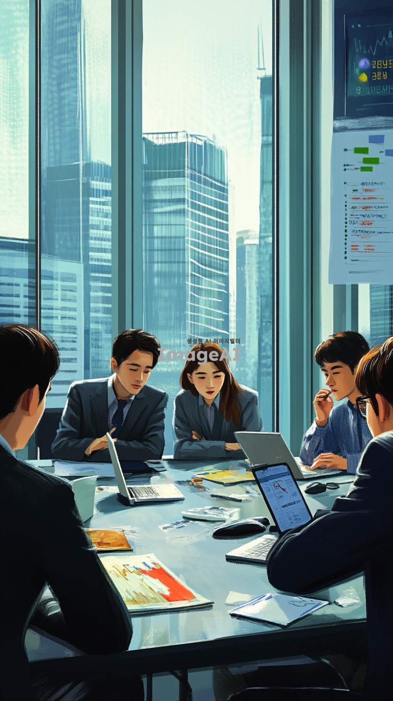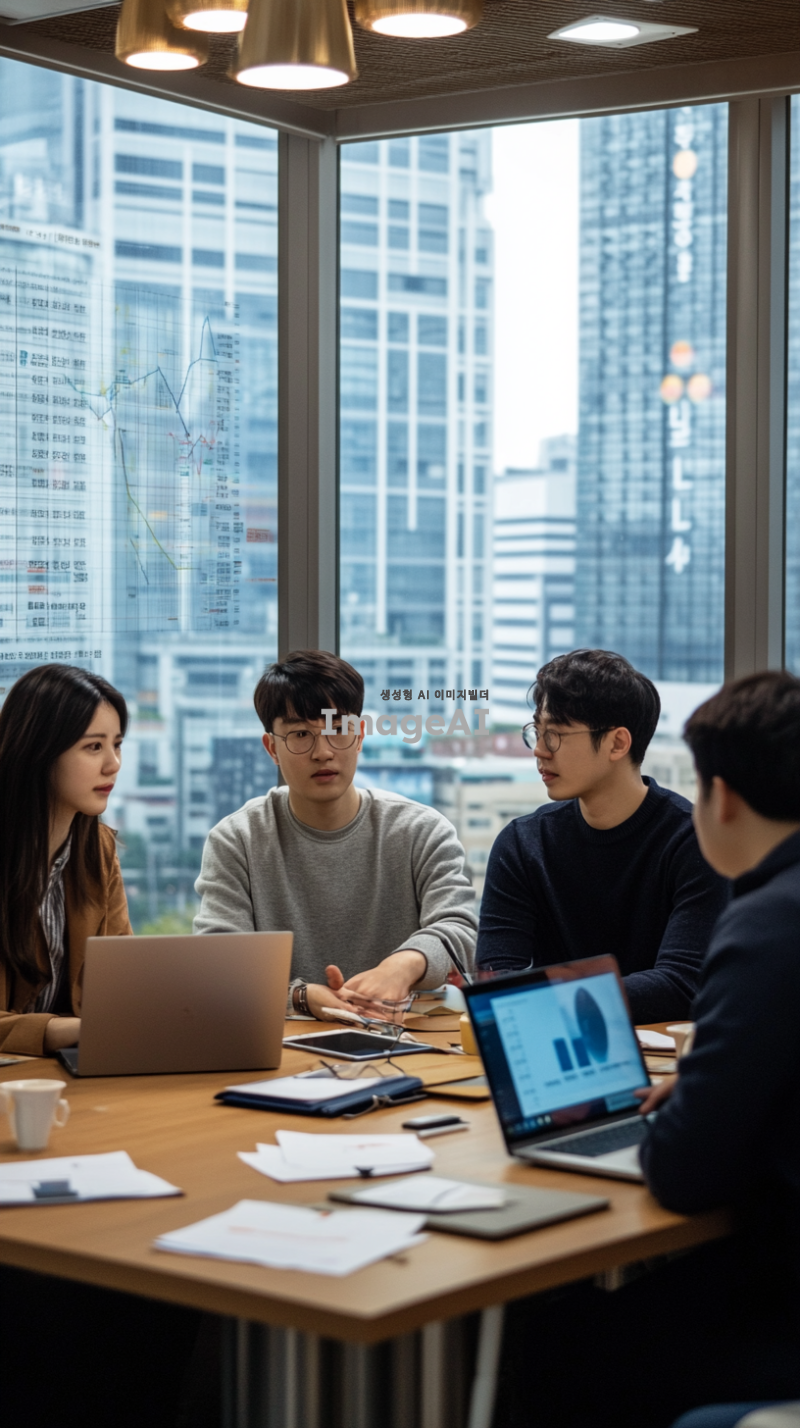 현대적인 사무실 공간에서 여러 명의 한국인들이 회의 테이블에 둘러앉아 노트북과 스마트폰을 보며 코인 매수를 고민하는 모습. 각자의 표정은 진지하고 약간의 긴장감이 감돌며, 테이블 위에는 다양한 코인 관련 서적과 노트가 흩어져 있다. 창문 밖으로는 도시의 고층 빌딩들이 보이고, 벽에는 경제 차트와 그래프가 걸려 있다. 자연광이 부드럽게 실내를 비추며, 실내는 깔끔하고 현대적인 인테리어로 꾸며져 있다.