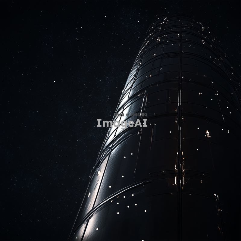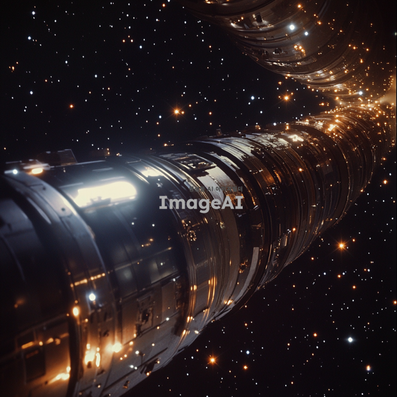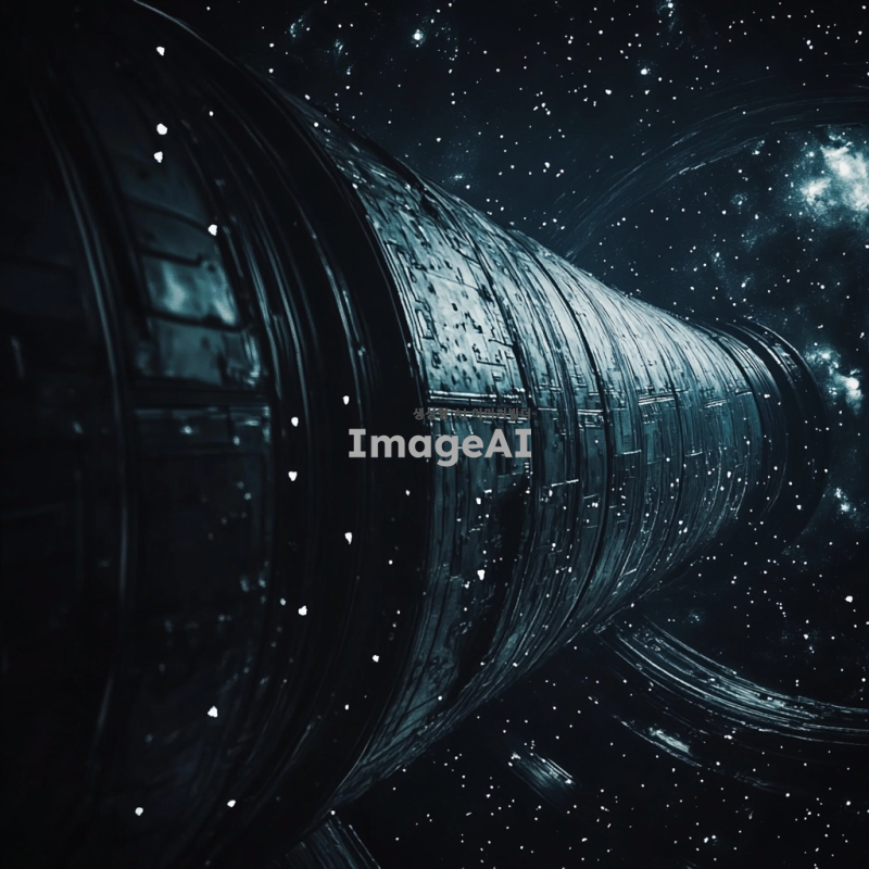 어두운 배경에 별빛이 반짝이는 우주 공간, 차가운 공허함이 느껴지는 분위기. 서서히 카메라가 이동하며 거대한 원통형 구조물이 등장하는 장면, 구조물은 금속성 재질로 빛을 반사하며 신비로운 느낌을 줌.