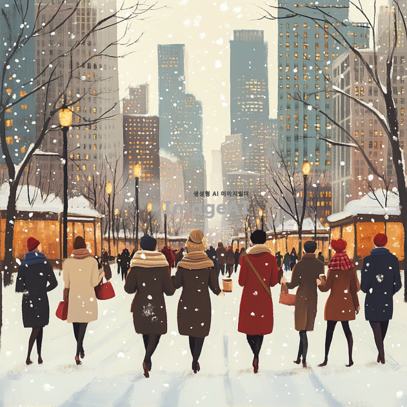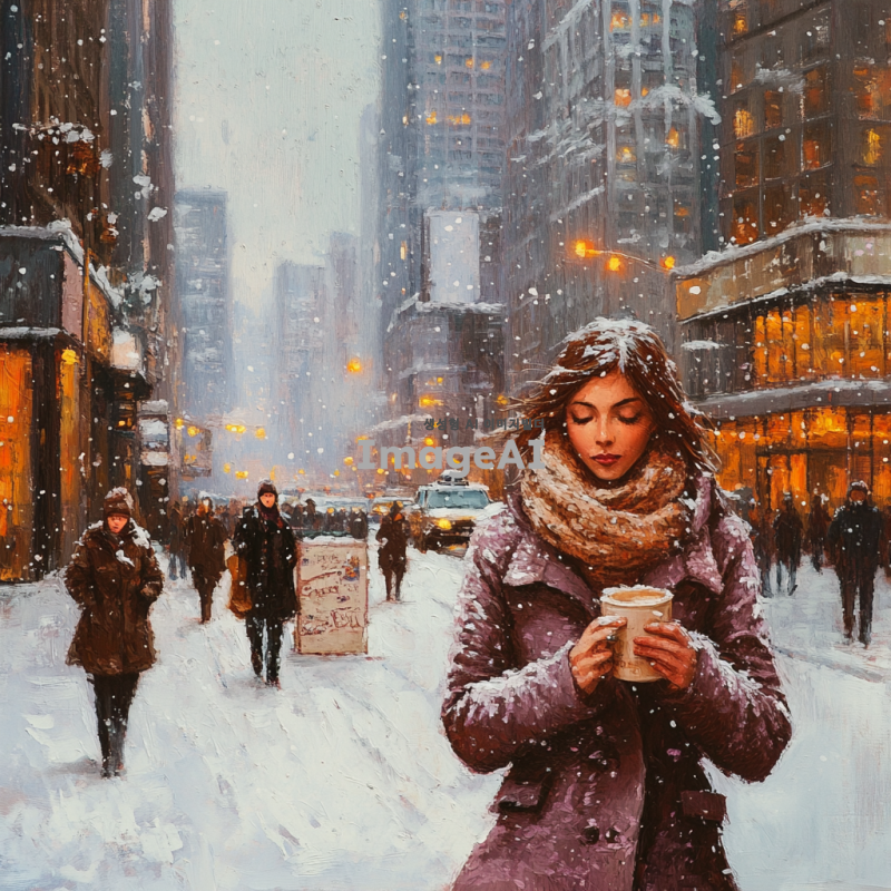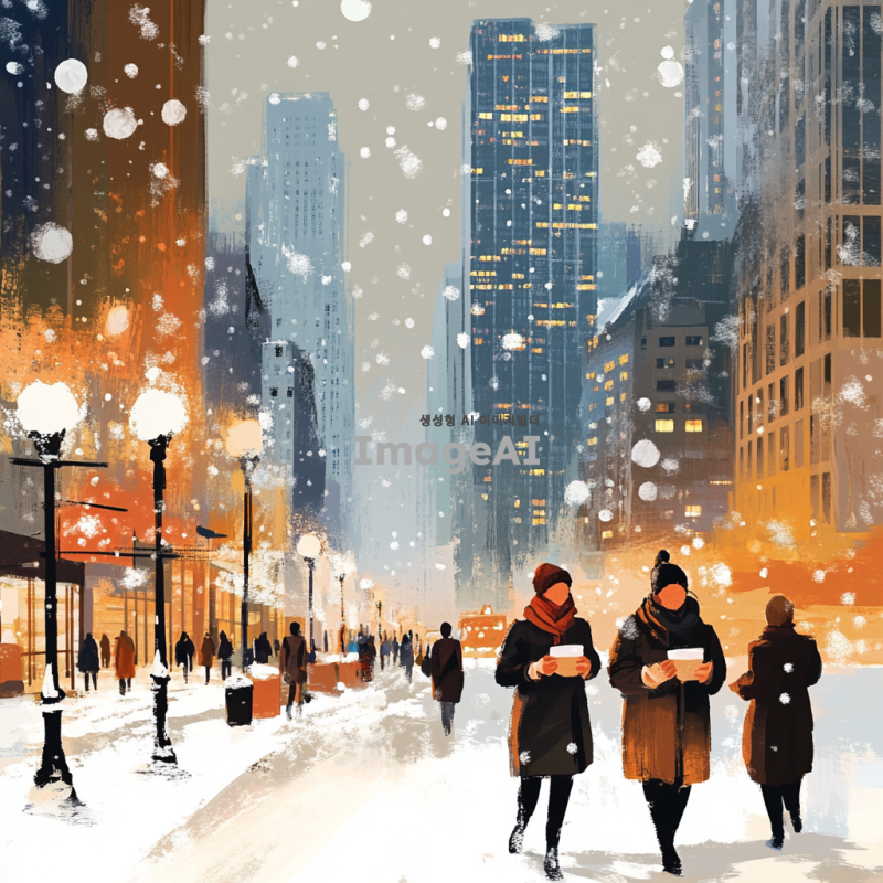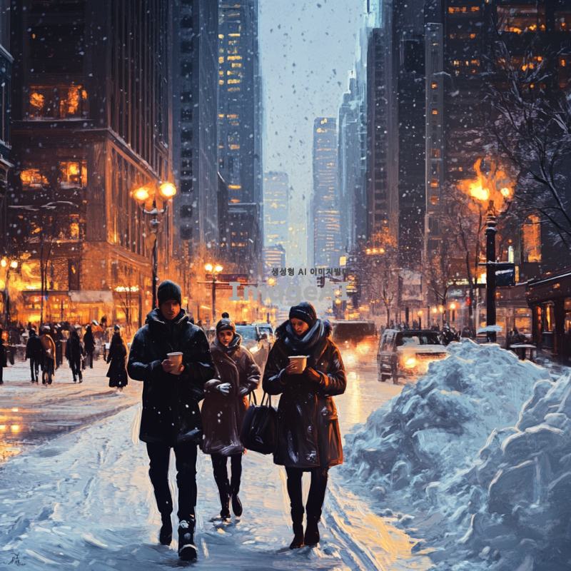 겨울 아침, 눈이 내린 도시의 출근길 풍경, 두꺼운 코트와 목도리를 두른 사람들이 바쁘게 걸어가는 모습, 손에 따뜻한 커피를 들고 있는 직장인, 길가에 쌓인 눈과 반짝이는 가로등 불빛, 차가운 공기를 표현하는 입김, 회색 하늘과 대비되는 따뜻한 색감의 도시 배경, 현대적인 고층 빌딩과 도심 속의 겨울 분위기.