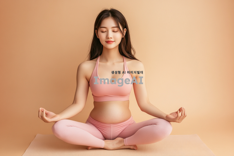 젊은 아시아 여성, 요가 정자세, 분홍색 요가복 착용, 따뜻한 베이지 톤의 배경, 평온하고 집중된 표정, 부드러운 자연광, 주변에 간단한 요가 매트와 식물 배치, 차분하고 조화로운 분위기.