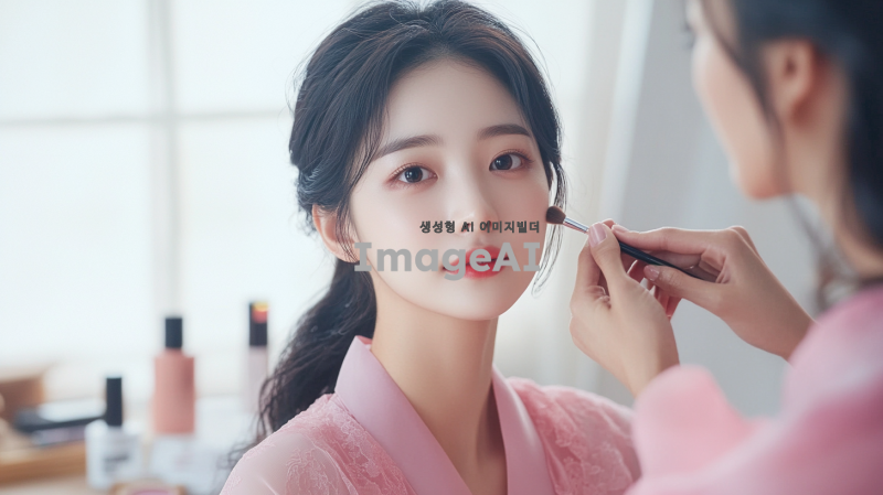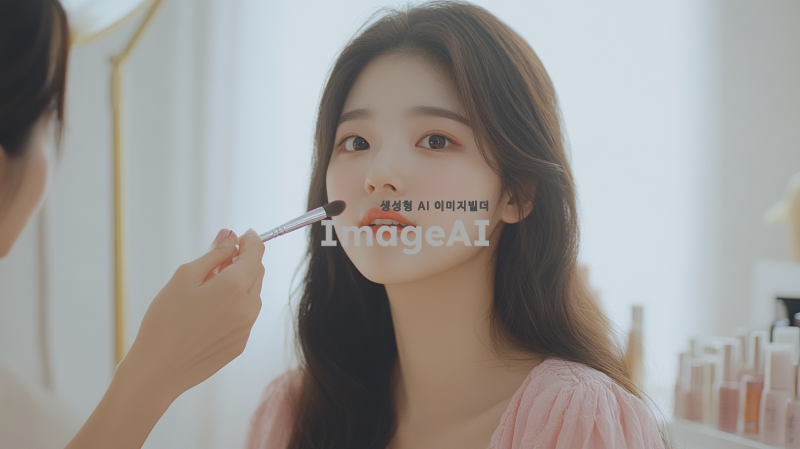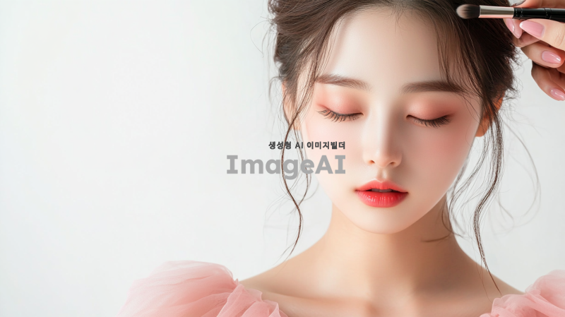 메이크업 아티스트에게 메이크업 받고 있는 젊은 한국 여성, 배경톤 화이트, 뒤에 메이크업 제품들이 배경으로 보임, 여성은 쉬폰 소재 분홍색 옷 입음