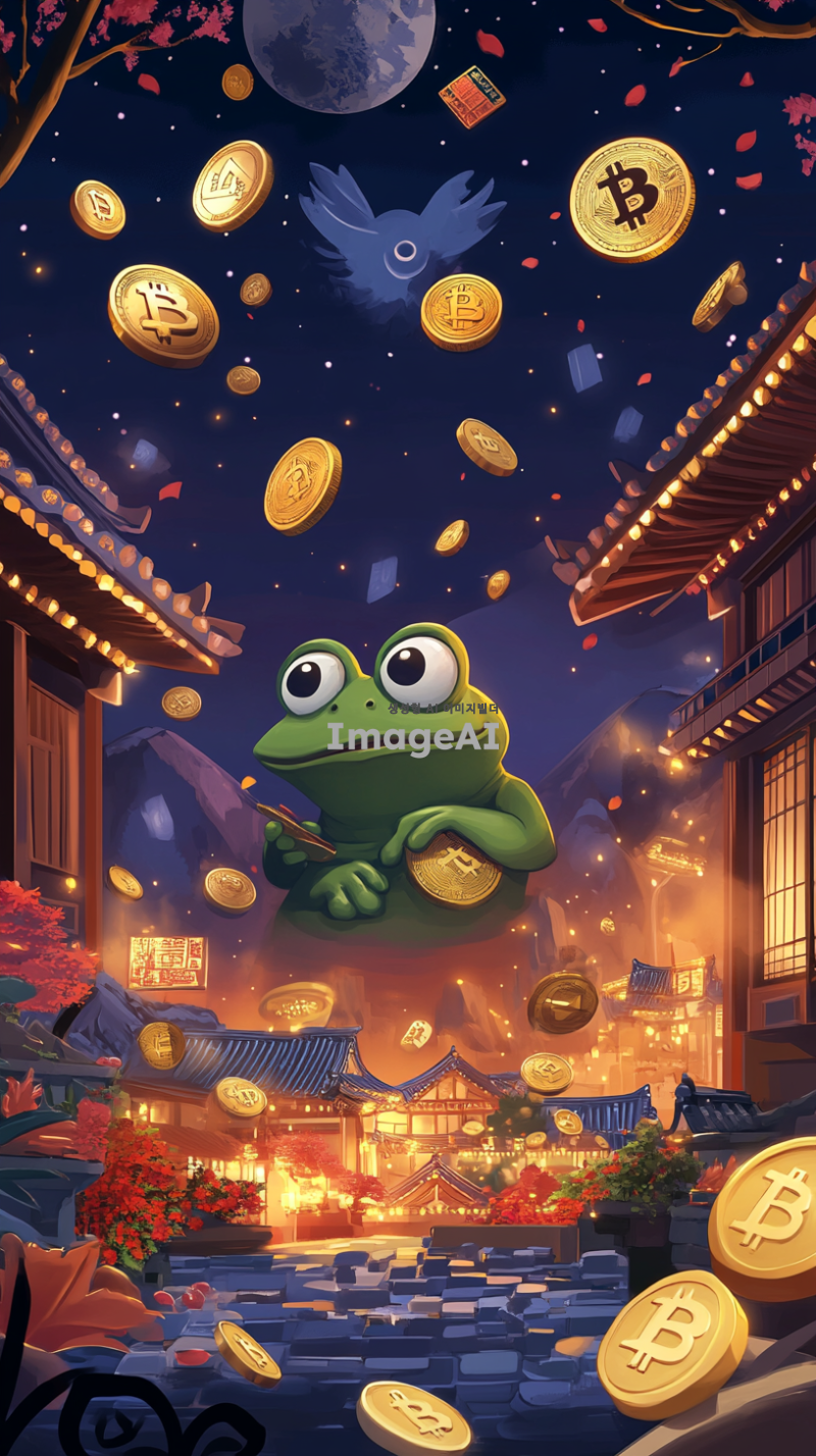 밝고 희망적인 분위기의 그래픽, 페페 개구리가 한국 전통 시장에서 코인 거래를 하는 모습, 주변에 다양한 암호화폐 상징들이 함께 있는 장면, 경제 성장과 번영을 상징하는 요소들 포함, 한국 전통 문양과 현대적인 금융 기술이 조화를 이루는 배경.