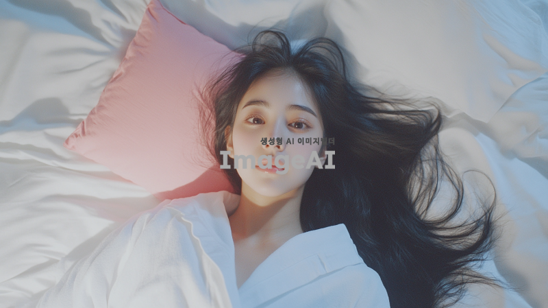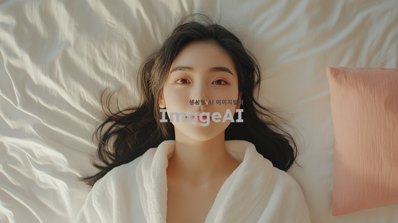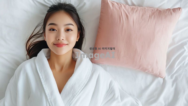 화이트배경, 흰색 침대에 누워있는 아시아 젊고 예쁜여성, 상체만 보임, 흰색 목욕 가운 입고있음, 분홍색 배개, 침대커버 침구류가 살짝 보임
