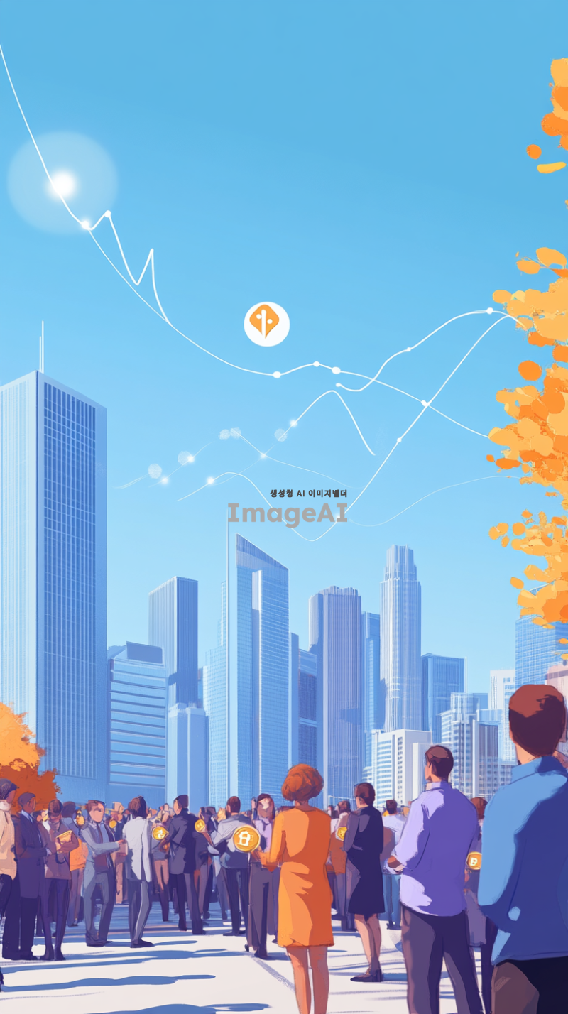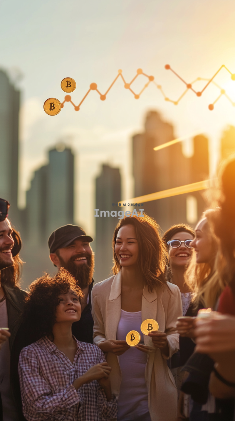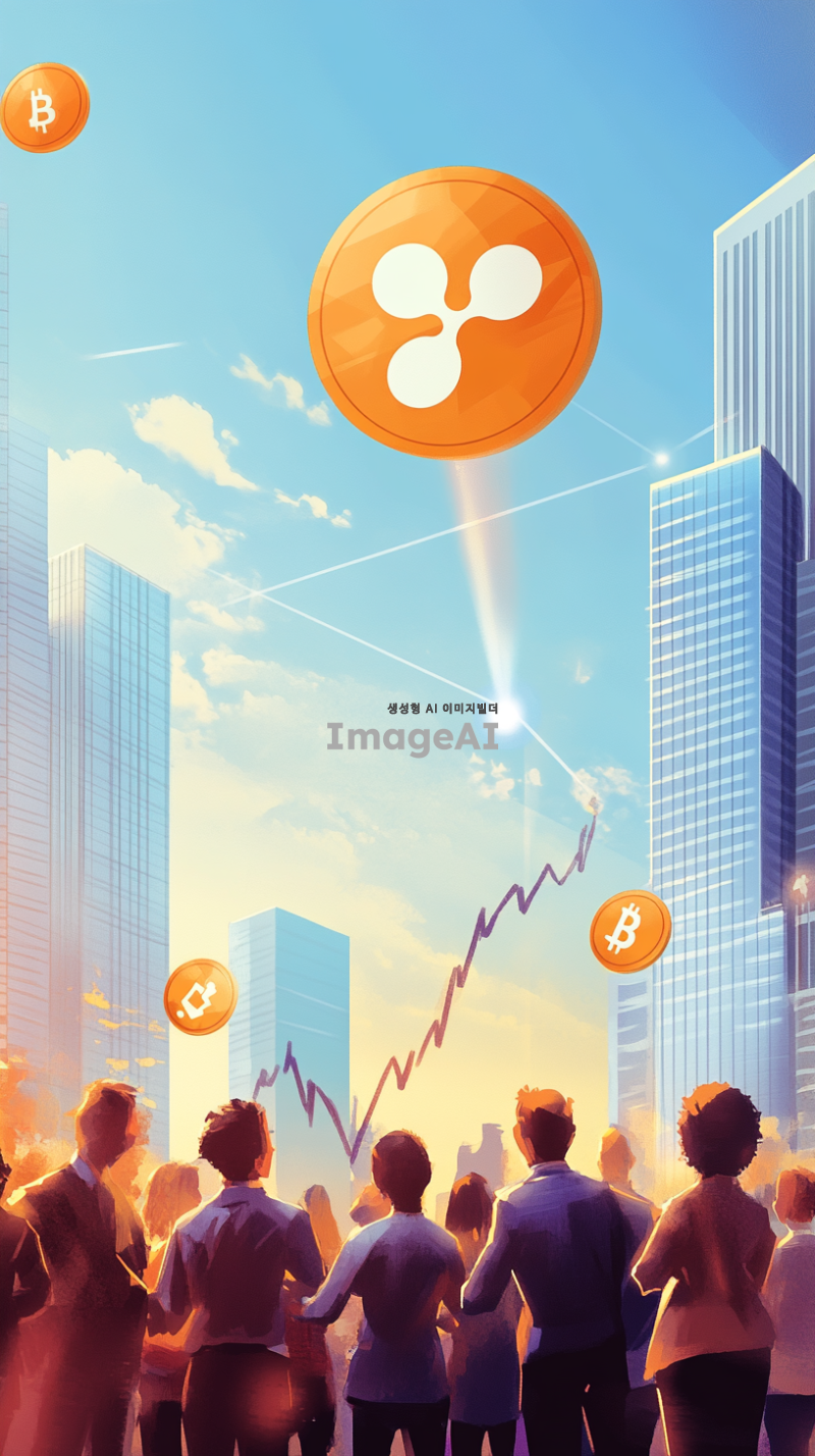 리플코인이 상승하는 장면을 표현한 이미지. 배경은 현대적인 금융도시의 스카이라인, 하늘은 맑고 밝은 햇살이 비추고 있으며, 코인 그래프가 급상승하는 모습. 그래프 옆에는 리플 로고가 빛나고 있고, 주변에는 코인을 들고 환하게 미소 짓는 다양한 연령대의 사람들이 모여 있는 장면. 사람들은 비즈니스 캐주얼 복장을 하고 있으며, 긍정적이고 희망적인 분위기를 강조.