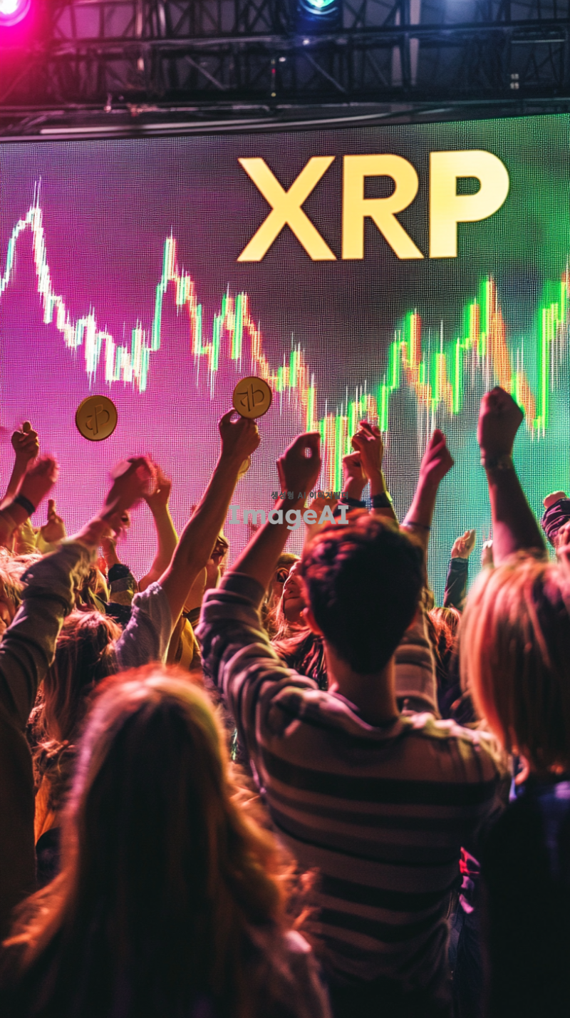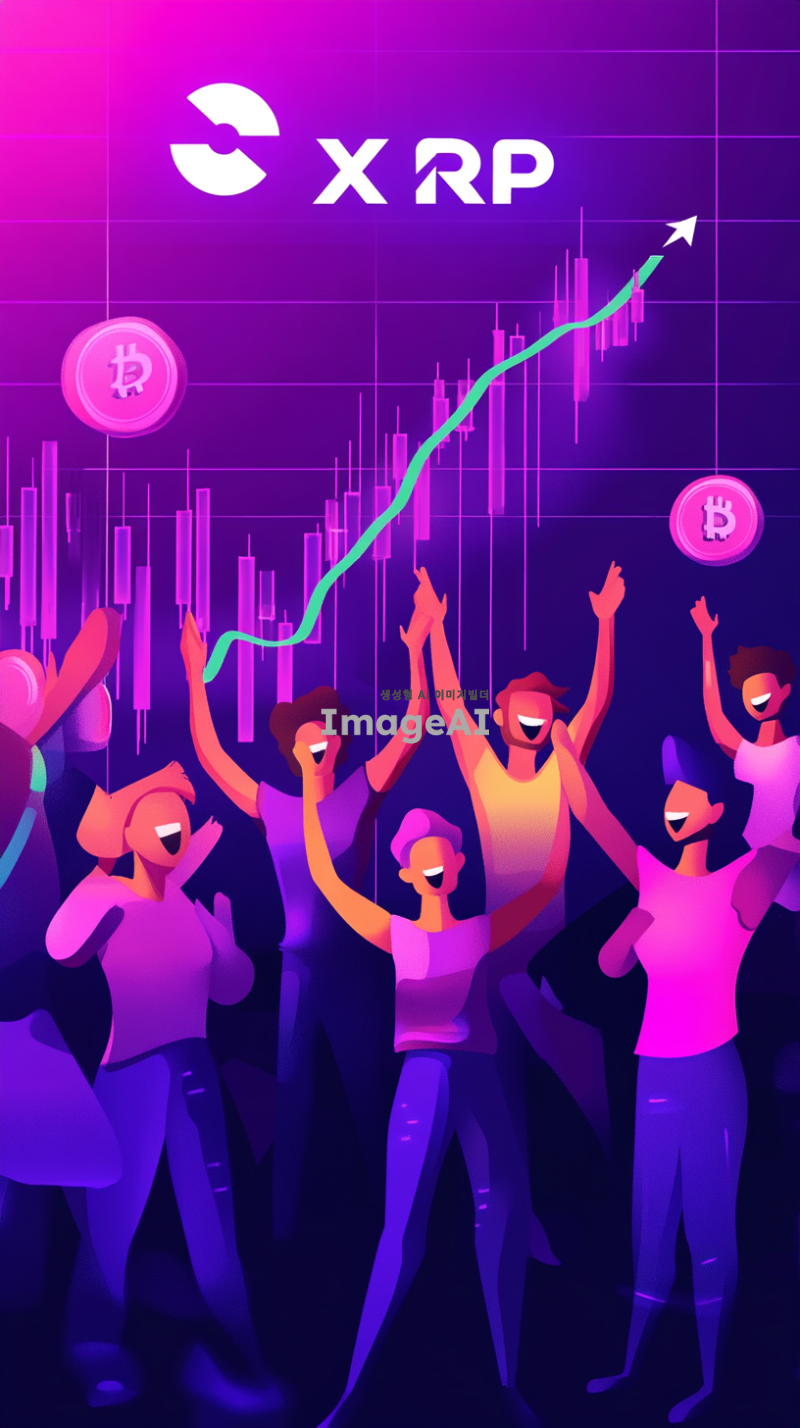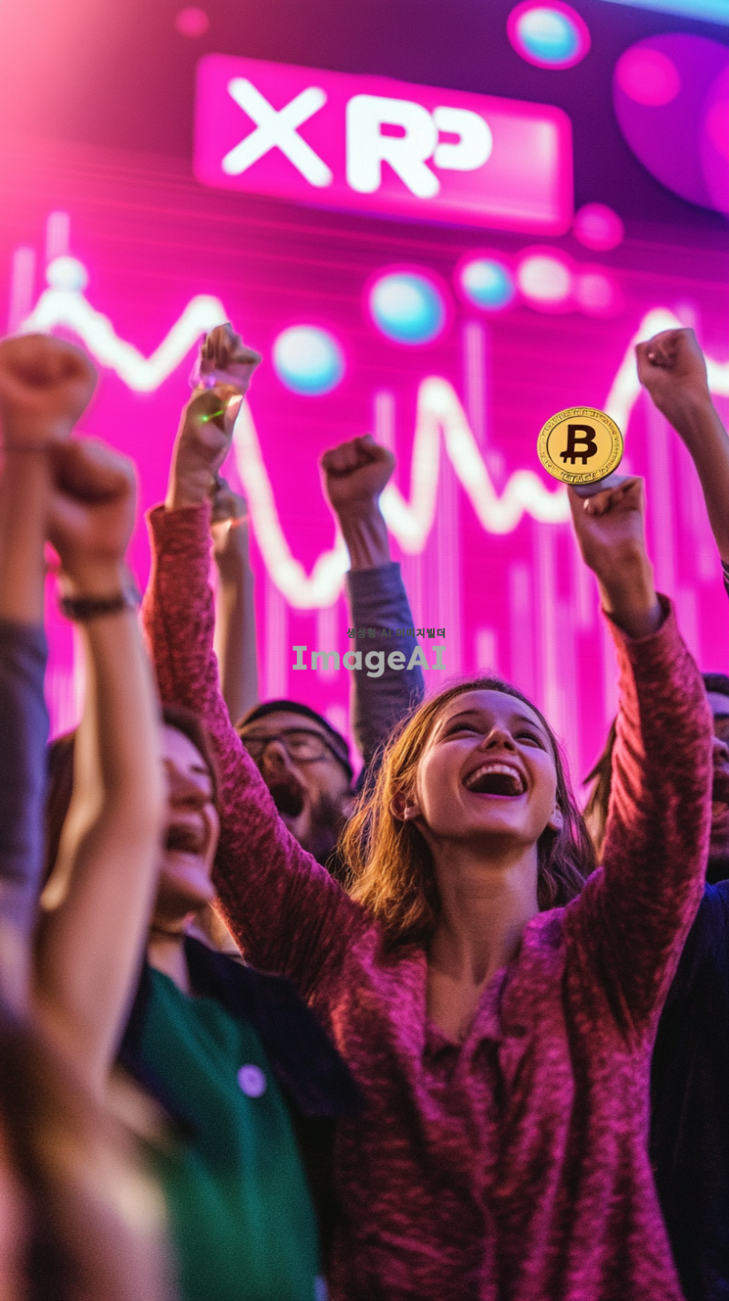 리플코인을 손에 들고 환호하는 사람들, 모두 밝고 기쁜 표정. 배경에는 "XRP"라고 적힌 코인 차트가 급상승하는 그래프가 크게 그려져 있으며, 그래프의 상승 곡선이 강조되어 있음. 사람들은 다양한 연령대와 성별로 구성되어 있으며, 모두 캐주얼한 복장을 하고 있음. 주변 분위기는 활기차고 긍정적인 느낌을 주며, 배경의 색상은 차트의 상승세를 강조하기 위해 밝고 생동감 있는 색조로 표현됨.