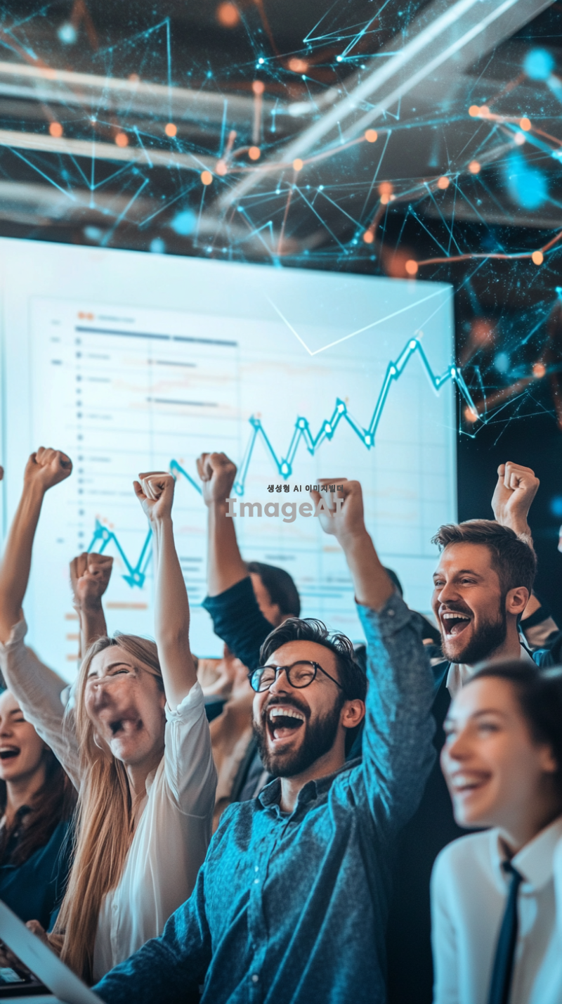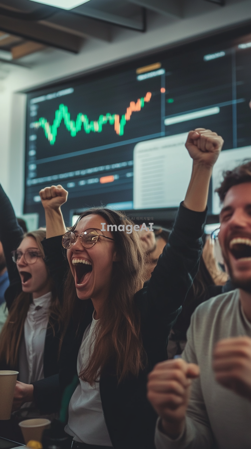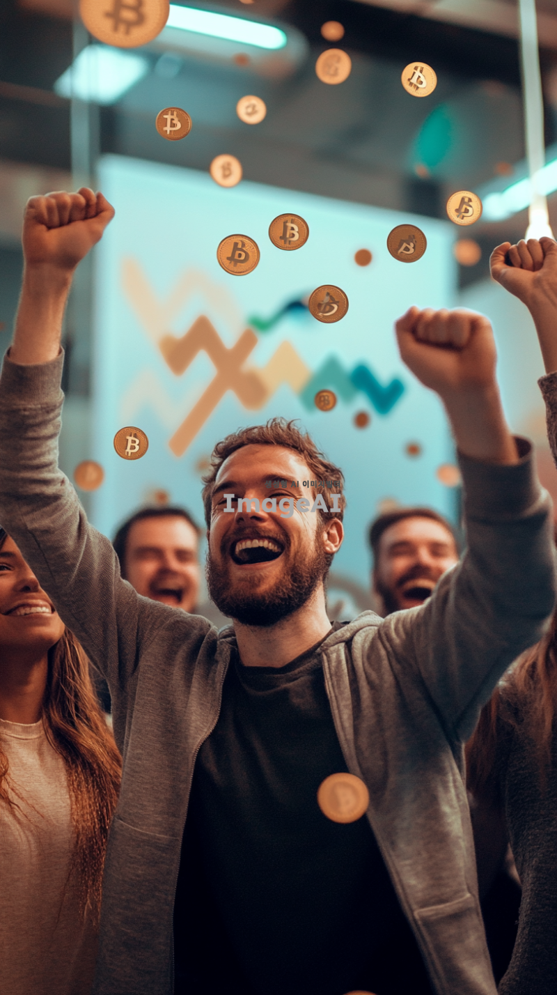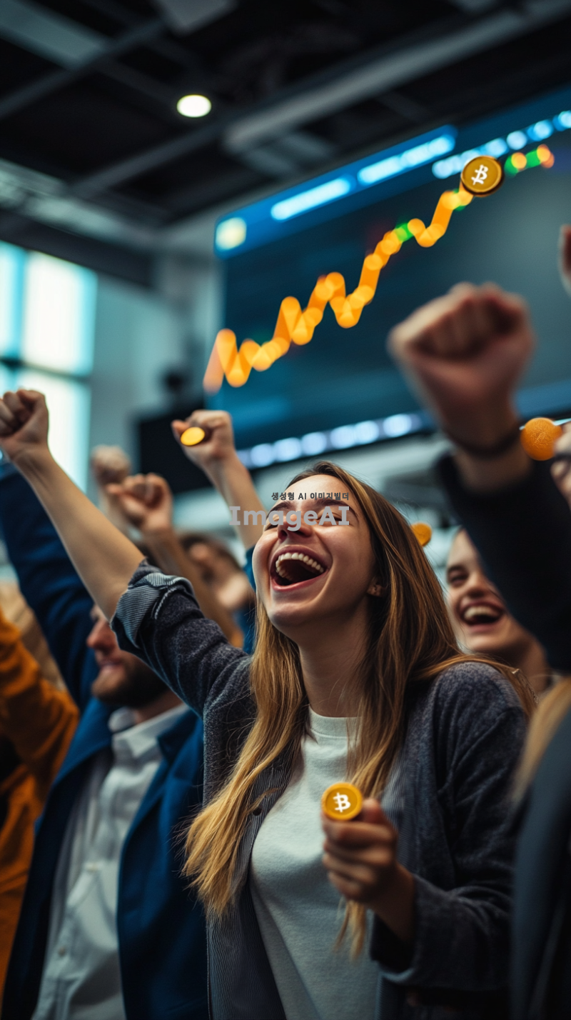 리플 코인을 들고 환호하는 사람들, 배경에는 XRP라고 적힌 상승 그래프가 있는 차트, 현대적인 사무실 환경, 밝고 희망적인 분위기, 역동적인 표현, 다양한 연령대와 성별의 사람들, 차트의 선명한 디테일, 경제적 성공과 긍정적인 에너지를 강조