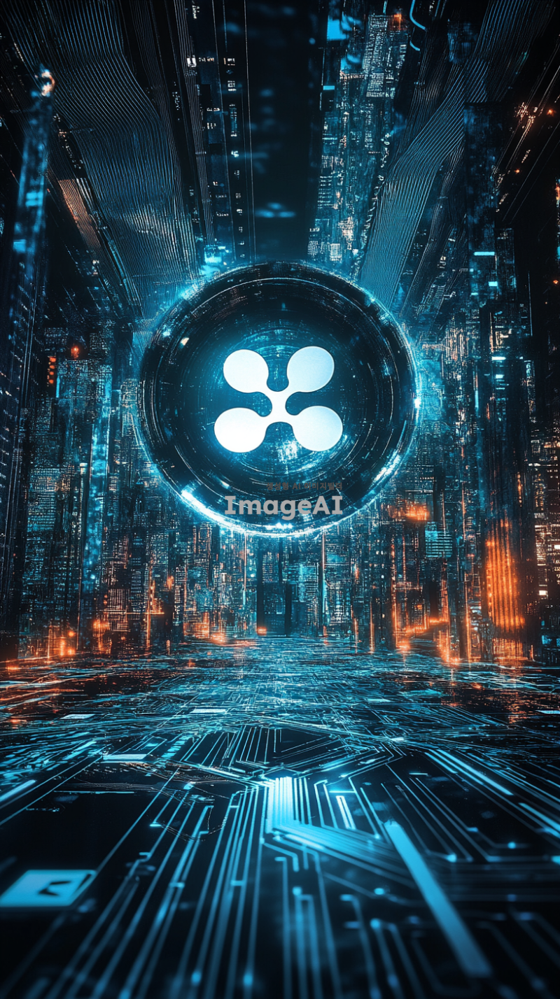 밝고 미래지향적인 분위기의 디지털 아트, 중심에 리플코인 XRP 로고가 빛나고 있으며, 주변에는 블록체인과 금융의 상징적인 이미지들이 조화를 이루고 있는 장면. 하늘에는 푸른색과 은색의 조화가 어우러져 있으며, 바닥에는 전자회로 패턴이 깔려 있어 기술적 혁신을 강조. 전체적으로 현대적이고 세련된 느낌을 주는 디자인.