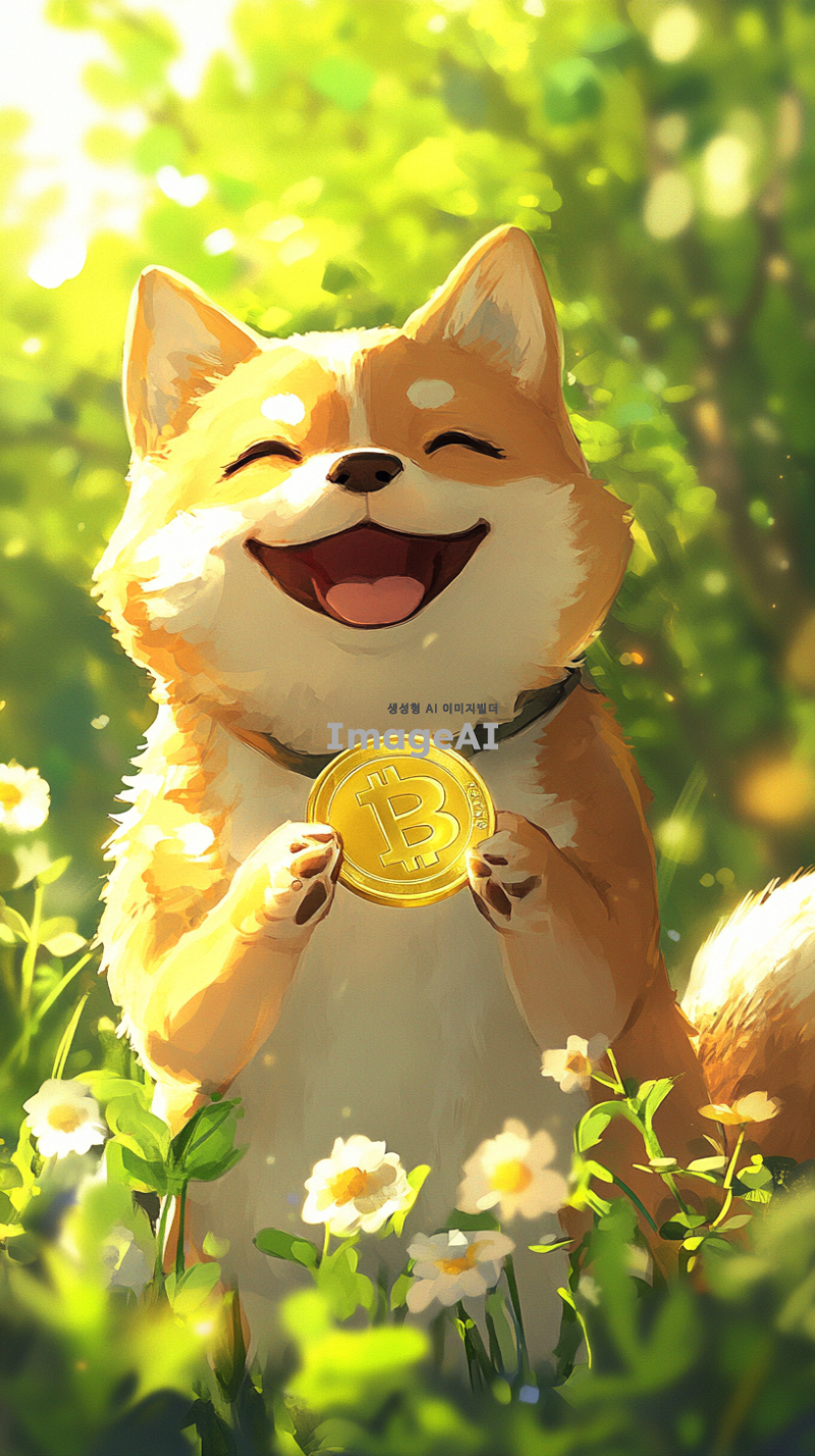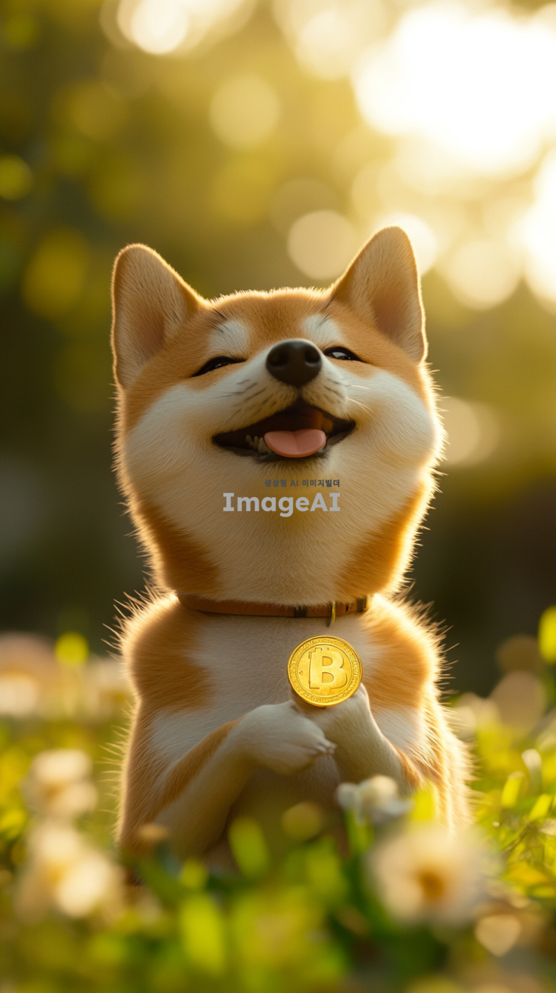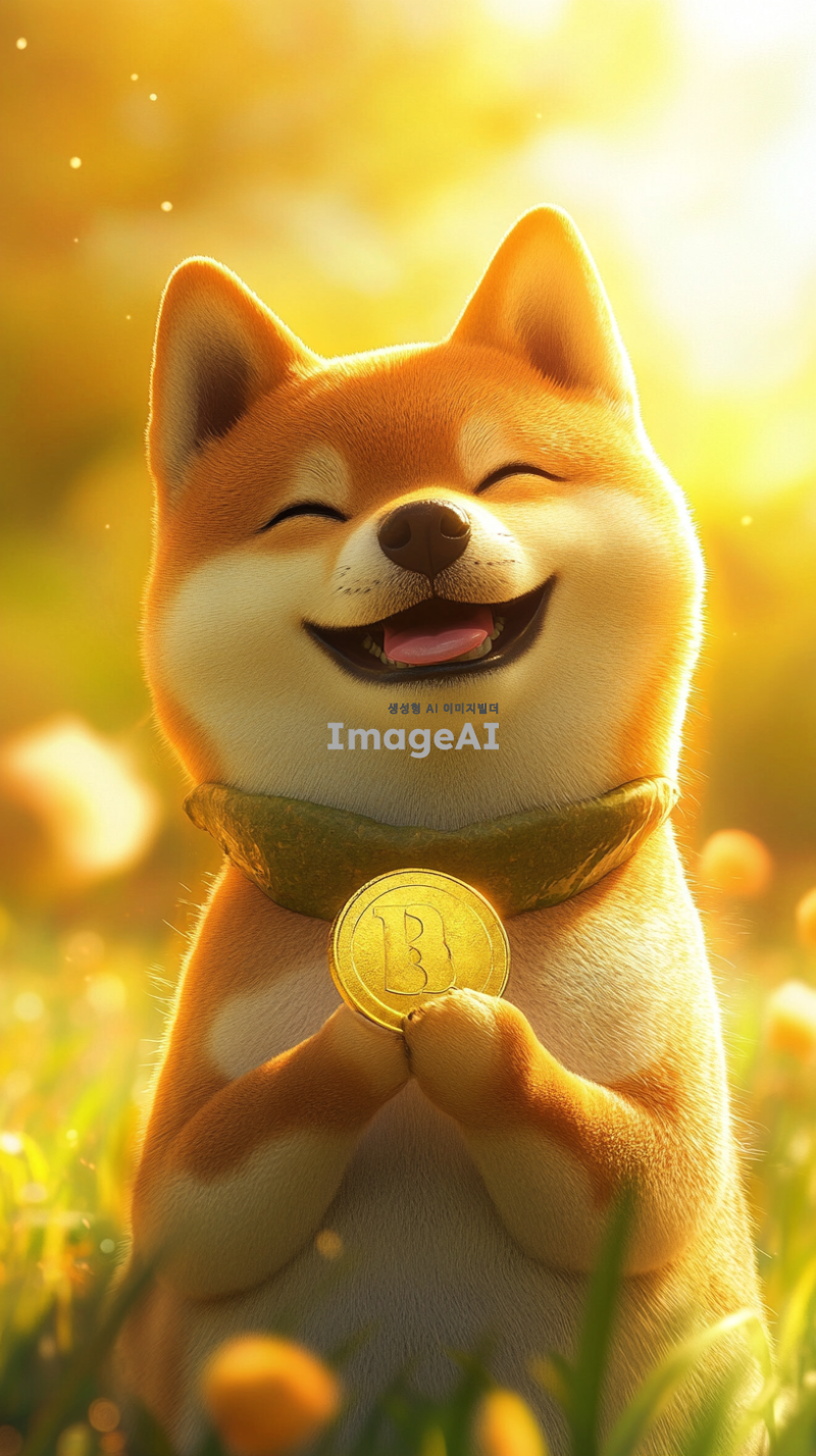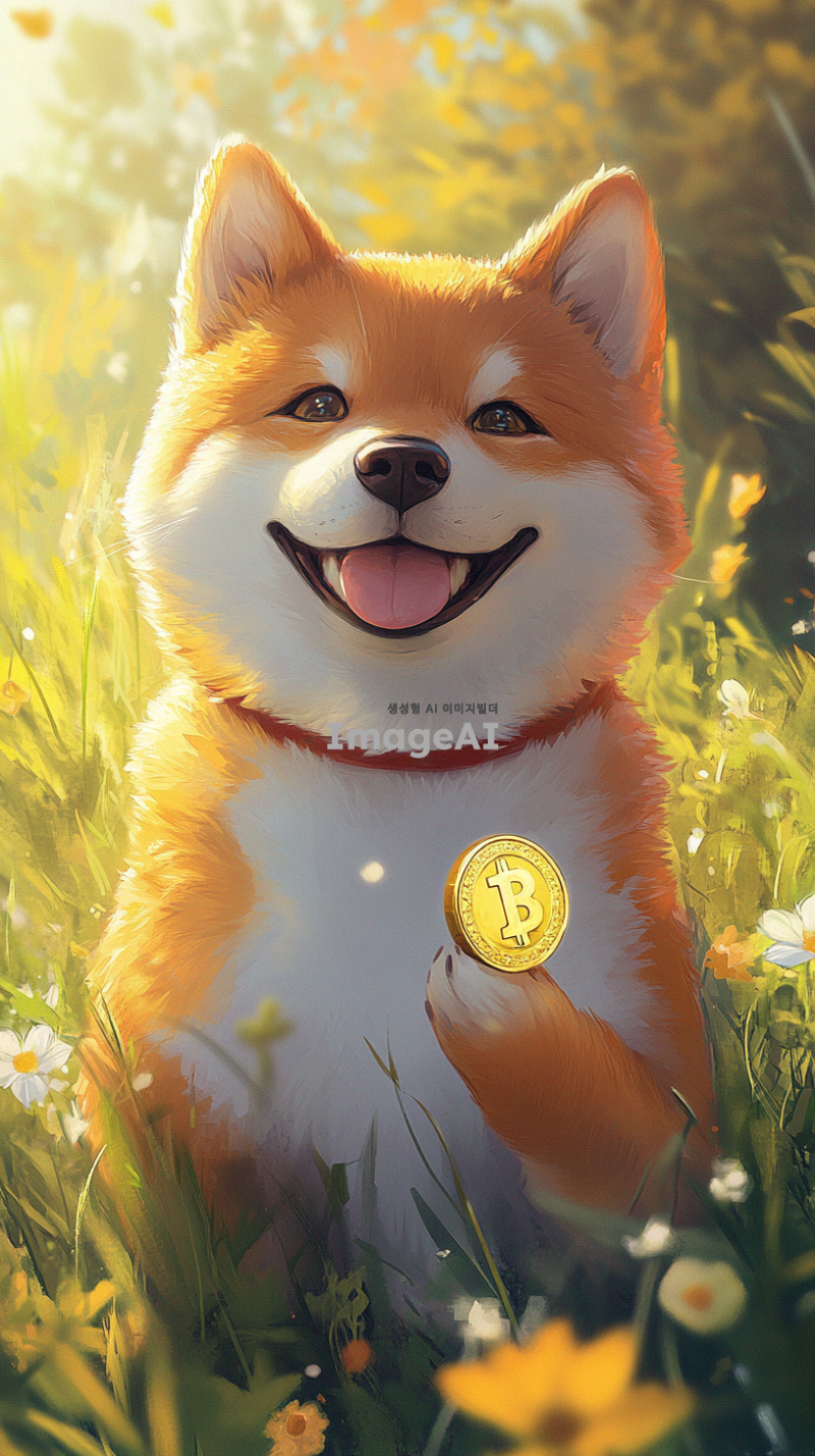 초록색 잔디밭 배경, 시바이누가 금색 코인을 들고 환하게 웃고 있는 모습, 밝고 생동감 있는 분위기, 따뜻한 햇살이 비치는 장면, 귀여운 표정과 생동감 있는 털 표현.