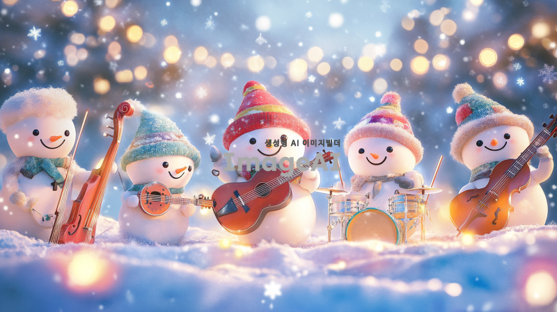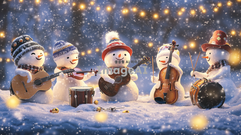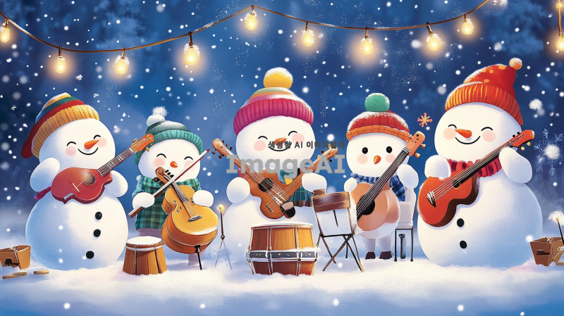 겨울 축제 분위기의 눈 덮인 배경, 각기 다른 귀여운 모자를 쓴 5명의 한국인 눈사람, 각각 기타, 바이올린, 드럼, 플루트, 피아노 같은 다양한 악기를 연주하며 웃고 있는 모습, 주변에는 반짝이는 조명과 작은 눈송이가 흩날리는 장면, 따뜻하고 아늑한 분위기, 밝고 생동감 넘치는 색감.
