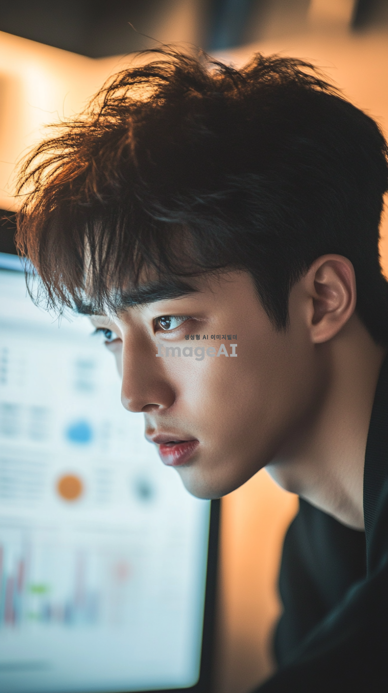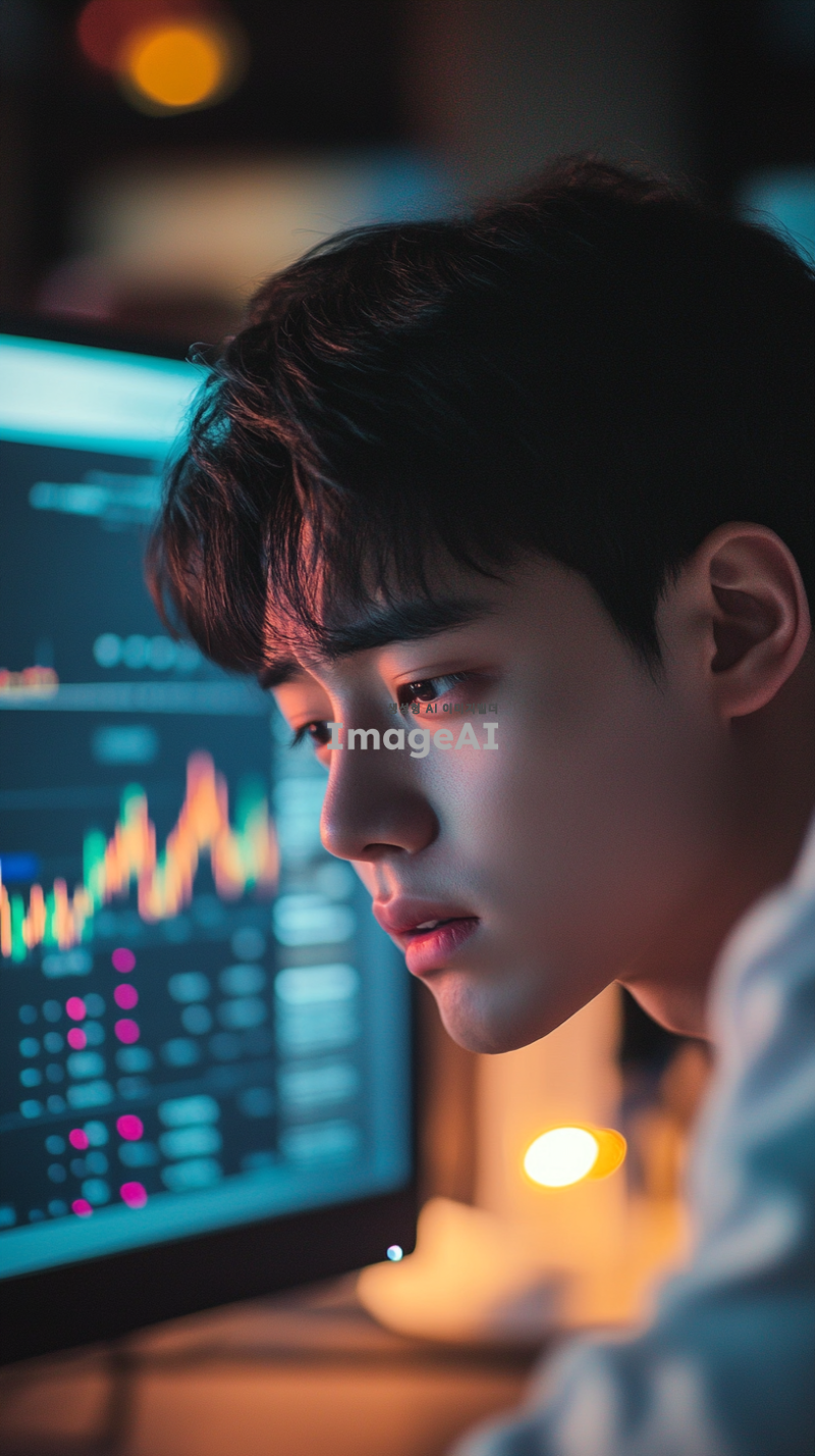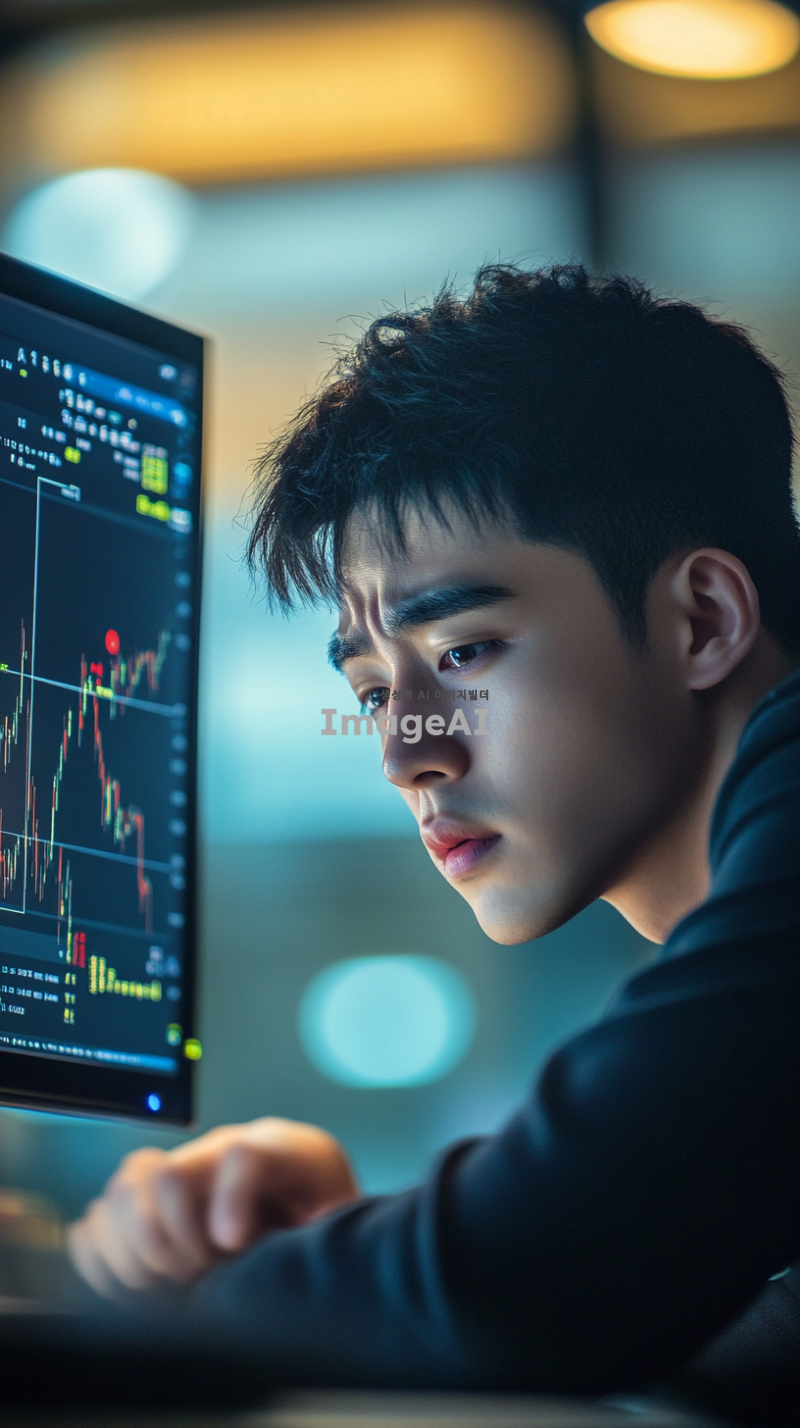 젊은 20대 한국 남성이 아쉬운 표정으로 코인 차트를 바라보며 고개를 살짝 숙이고 있는 모습, 차트는 컴퓨터 화면에 표시되어 있으며, 배경은 현대적인 사무실 환경, 남성은 캐주얼한 옷차림, 화면의 빛이 남성의 얼굴을 부드럽게 비추고 있는 장면, 감정이 잘 드러나는 얼굴 표정과 차트의 디테일이 강조된 이미지.