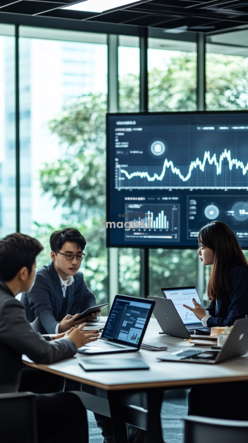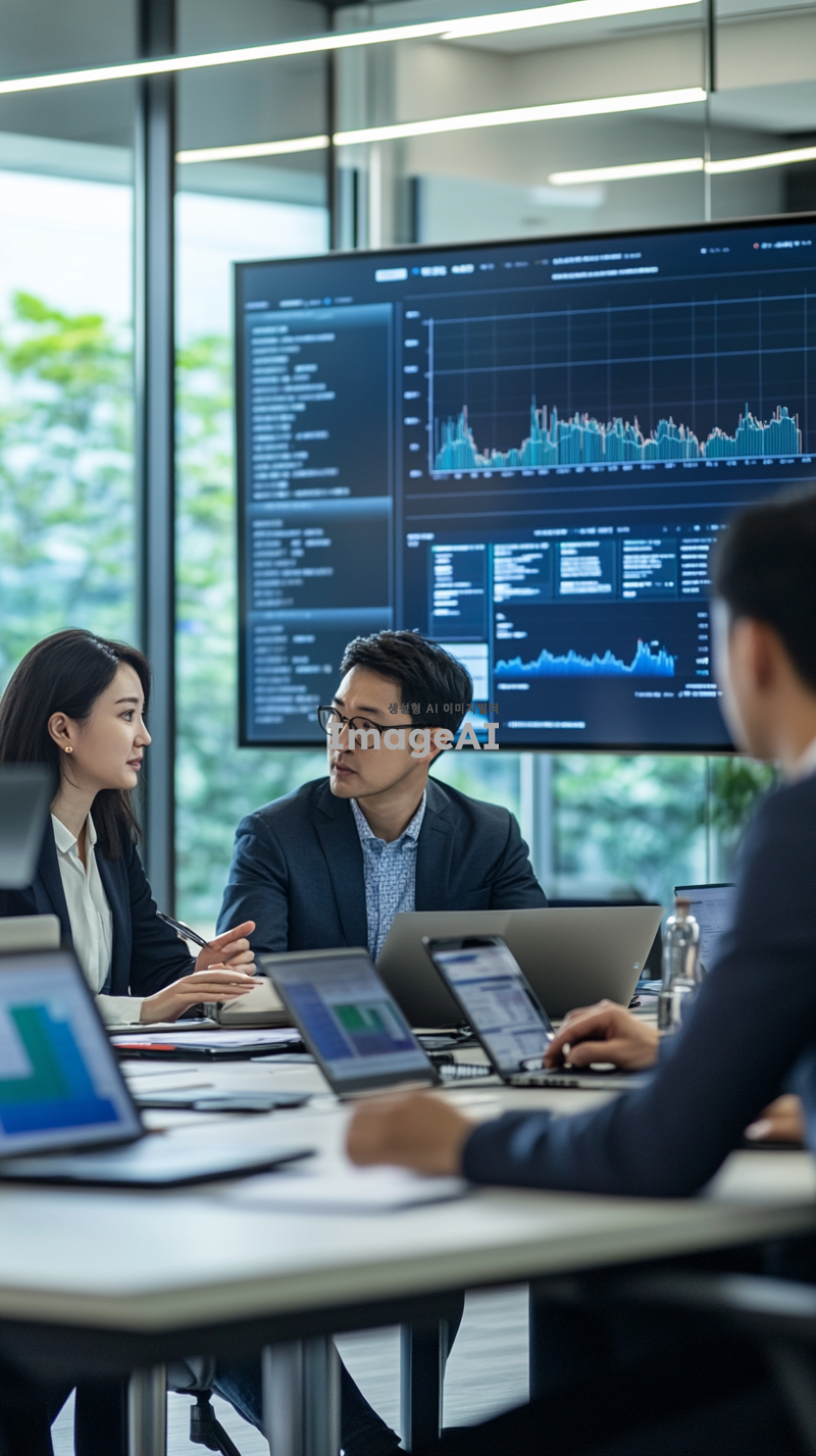 현대적인 사무실 환경에서 여러 명의 한국인 전문가들이 회의 테이블에 둘러앉아 노트북과 태블릿을 사용하여 암호화폐 시장을 분석하고 있는 장면. 벽에는 큰 스크린이 설치되어 있으며, 다양한 그래프와 차트가 표시되어 있다. 전문가들은 서로 토론하며 메모를 작성하고 있으며, 각자의 노트북 화면에는 복잡한 데이터와 분석 도구가 열려 있다. 배경은 깔끔하고 정돈된 사무실 인테리어로, 창문을 통해 자연광이 들어와 밝고 쾌적한 분위기를 연출하고 있다.
