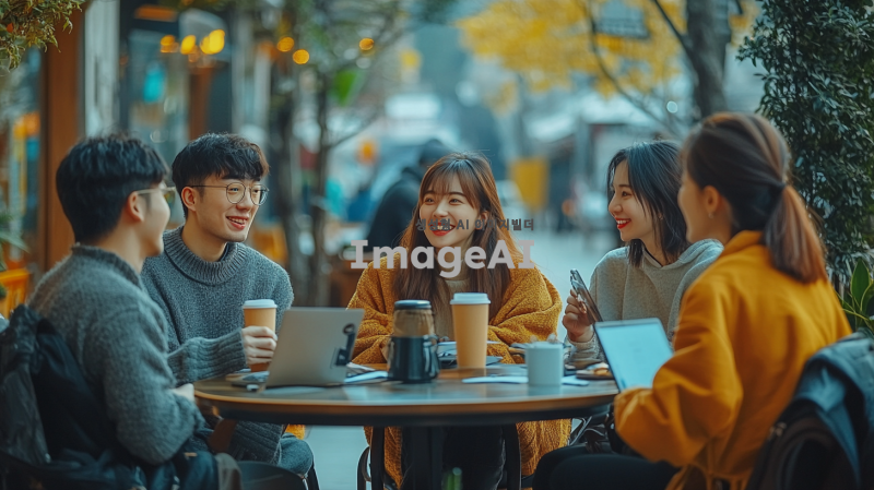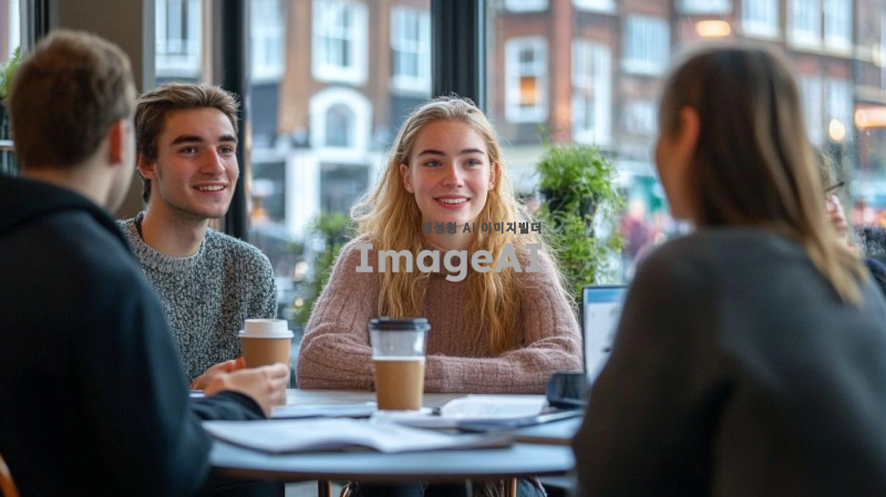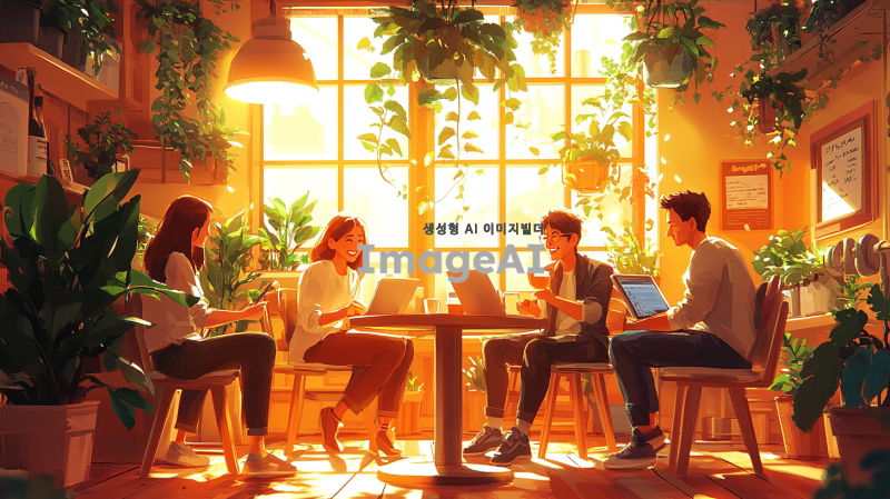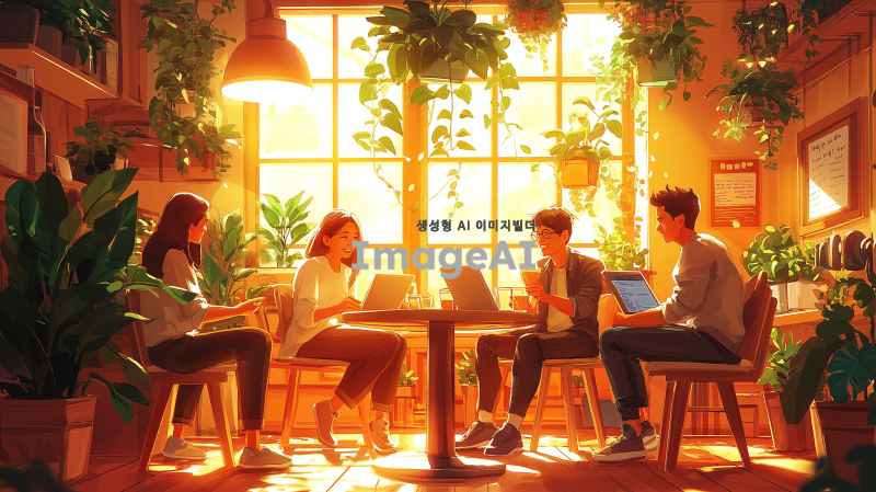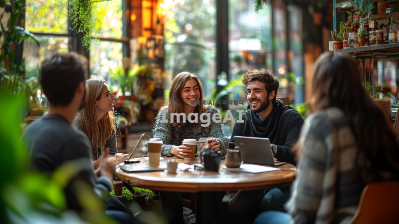 따뜻하고 편안한 분위기의 카페에서 다섯 명의 사람들이 둥근 테이블에 둘러앉아 대화를 나누고 있는 장면. 각자 커피나 차를 마시며 웃고 있는 모습, 테이블 위에는 노트북이나 메모장이 놓여 있어 자유로운 토론을 암시. 창문을 통해 부드러운 자연광이 들어오고, 벽에는 작은 화분들이 장식되어 있어 아늑한 느낌을 줌. 사람들은 캐주얼한 복장을 하고 있으며, 서로에게 집중하고 있는 모습. 배경은 따뜻한 색조로 편안한 분위기를 강조.