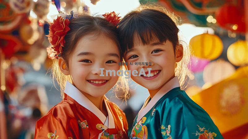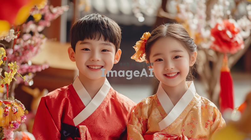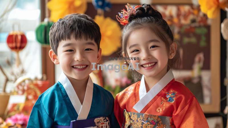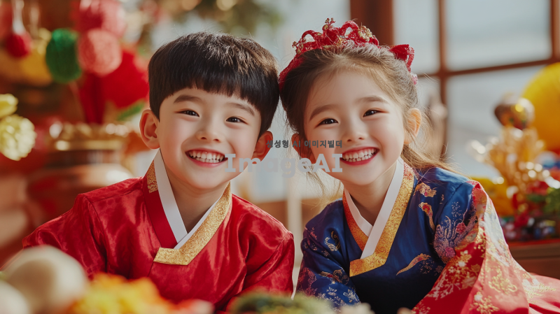 귀여운 남자아이와 여자아이가 전통적인 한복을 입고 환하게 웃으며 카메라를 바라보는 모습, 배경에는 한국의 전통적인 설날 분위기를 연출하는 장식과 소품들이 놓여 있으며, 밝고 따뜻한 색감으로 새해의 기쁨과 설렘을 표현하는 장면