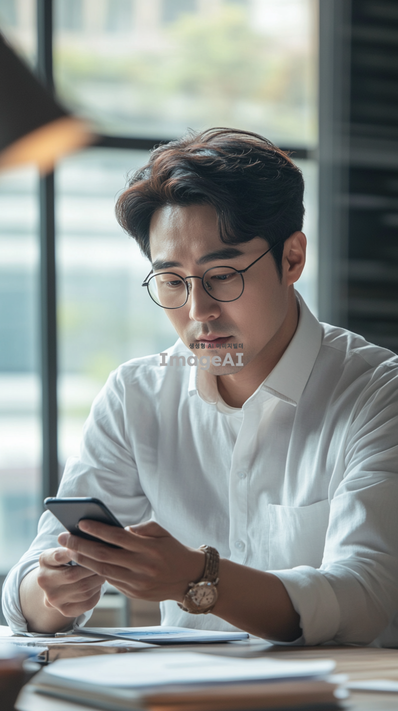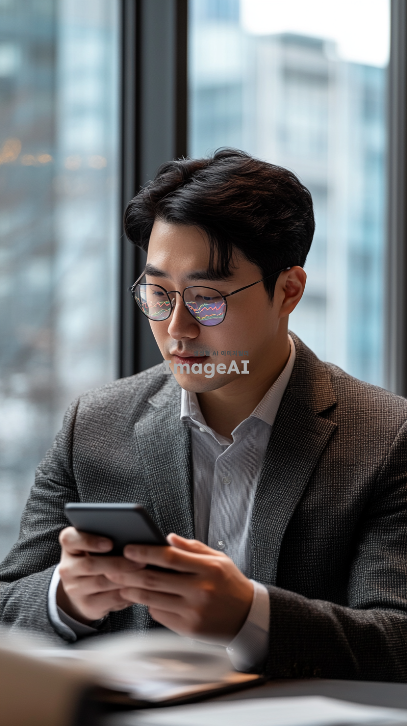 현대적인 사무실에서 창문을 배경으로 책상에 앉아 있는 한국인 남성, 집중한 표정으로 휴대폰을 들여다보며 차트를 분석하는 모습, 휴대폰 화면에 선명하게 보이는 상승하는 코인 차트, 차트의 세부사항이 강조된 화면, 차분하고 전문적인 분위기, 자연광이 부드럽게 비치는 실내, 남성은 비즈니스 캐주얼 복장을 하고 있음.