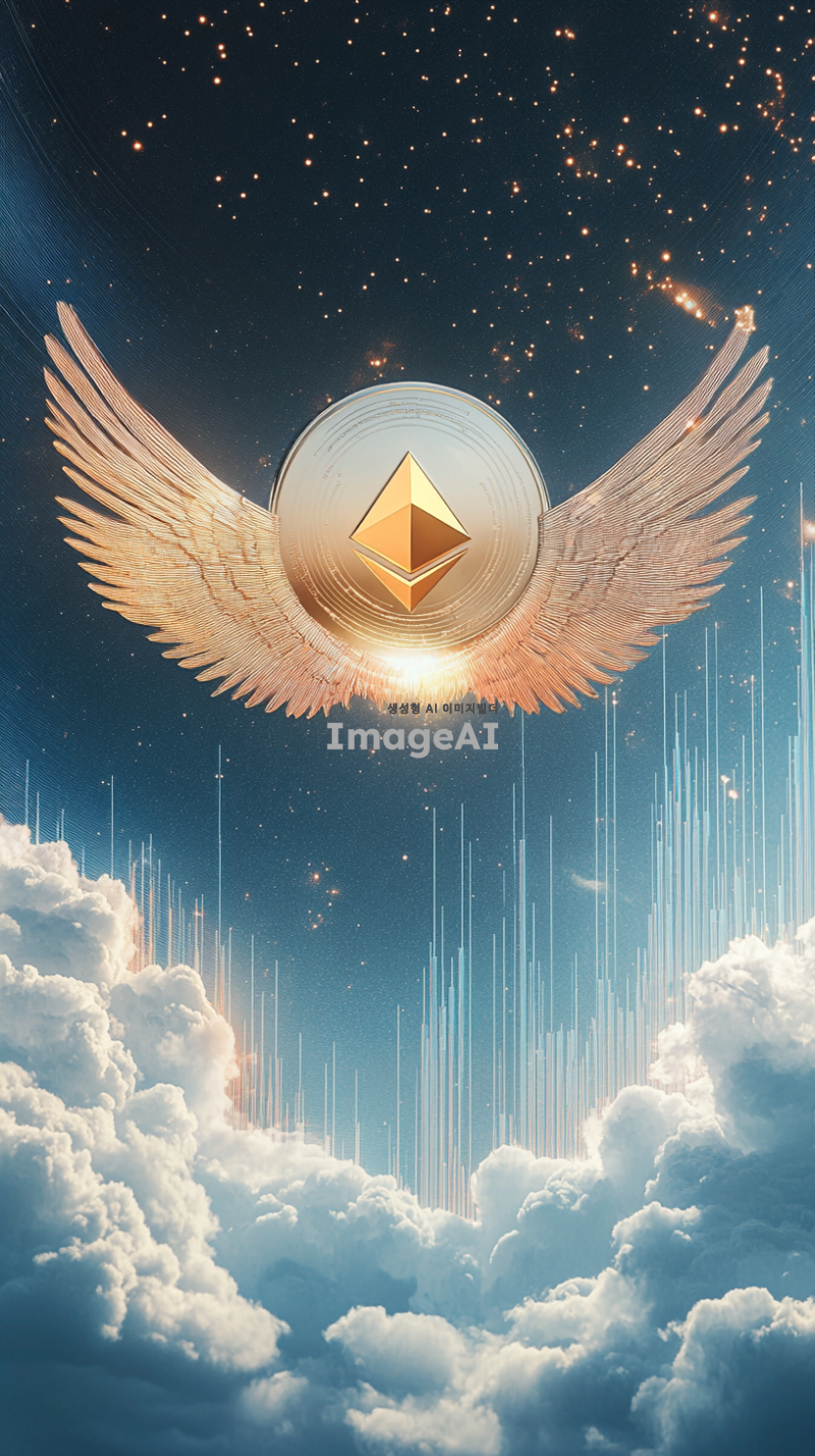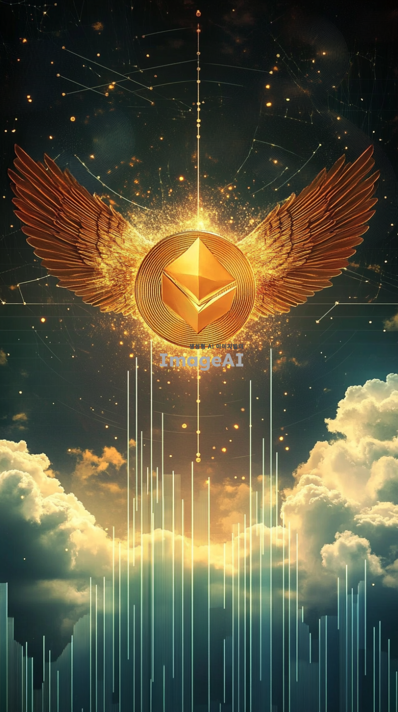 리플코인이 날개를 단 채로 하늘을 나는 모습, 배경은 코인 차트가 하늘처럼 펼쳐져 있으며, 차트의 그래프가 상승하는 곡선을 그리는 장면, 리플코인의 날개는 빛나는 금속 재질로 반짝이며, 주변에는 구름이 흩어져 있는 모습, 전체적인 분위기는 희망적이고 밝은 느낌.
