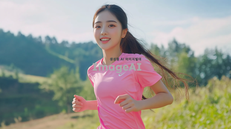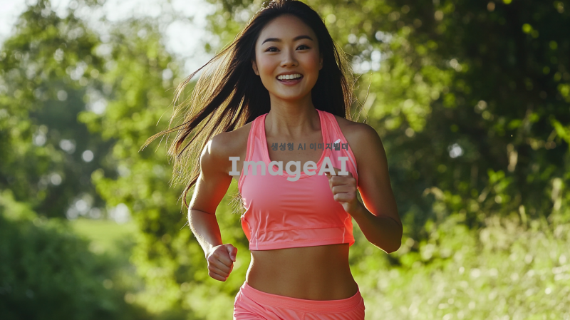 공원을 조깅하는 젊은 아시아 여성, 전체 여성컷, 분홍색 여름 러닝복을 입고 있으며, 긴 헤어스타일과 미소 짓는 얼굴, 뒷배경에는 밝은 초록색의 자연 경관.