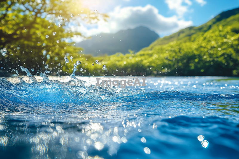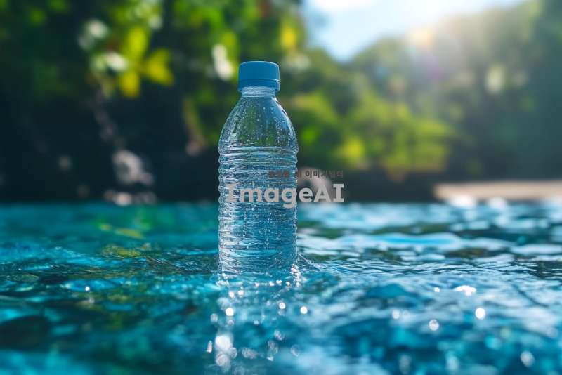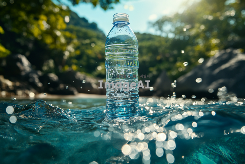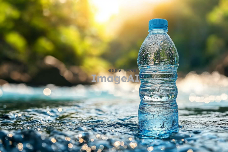 푸른 화산지역 산속 흐르는 깨끗한 물, 주변에는 푸른 나무와 자연이 어우러져 있으며, 햇살이 반짝이는 물결 위로 부드럽게 비추는 장면. 첨부이미지속 물병이 자연 속에 조화롭게 놓여 있고, 물방울이 맺혀 신선함을 강조하는 모습. 전체적으로 청량하고 상쾌한 분위기와 고급진 분위기 연출
