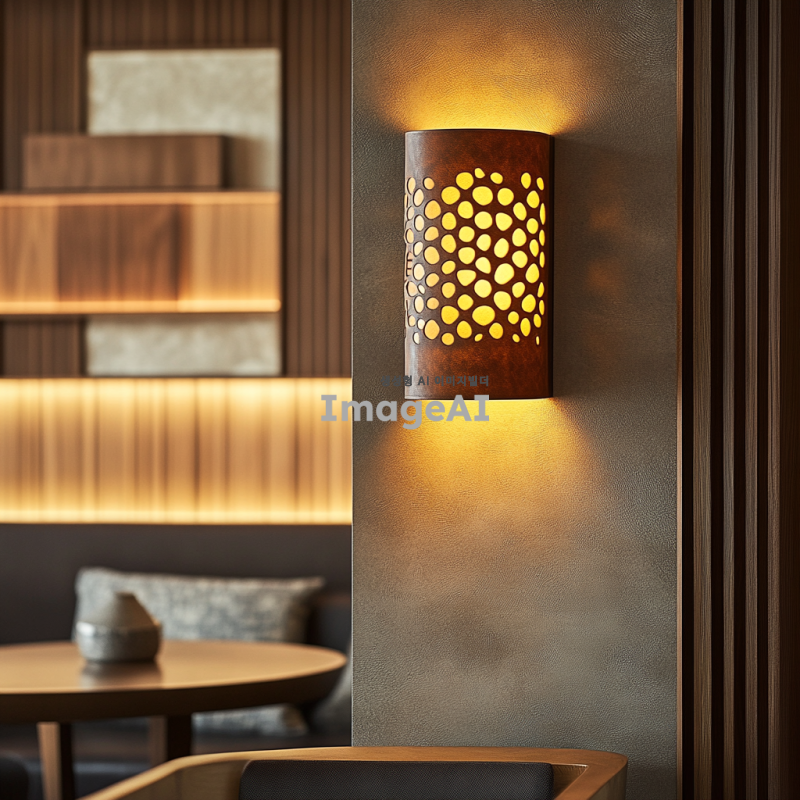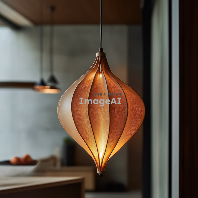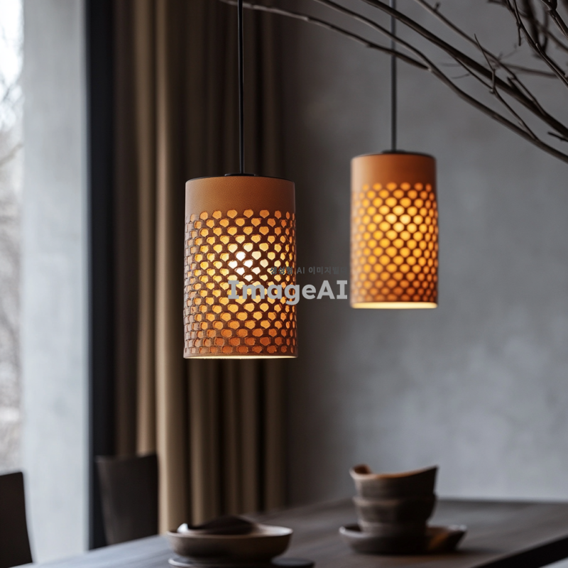 따뜻한 분위기를 연출하는 한국 전통 문양이 새겨진 현대적인 가죽 조명 디자인, 부드러운 갈색 가죽 소재, 은은한 노란빛이 퍼지는 조명, 자연스러운 질감, 세련되고 우아한 실루엣, 실내 인테리어에 어울리는 크기와 형태, 장인의 손길이 느껴지는 정교한 디테일, 현대적인 공간에 조화롭게 어우러지는 스타일.