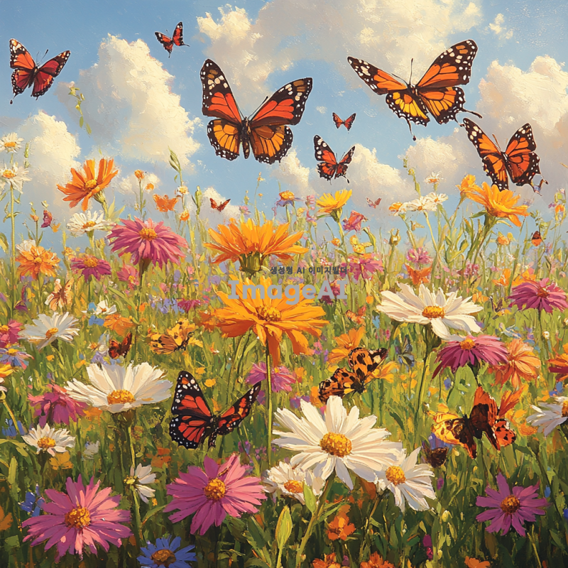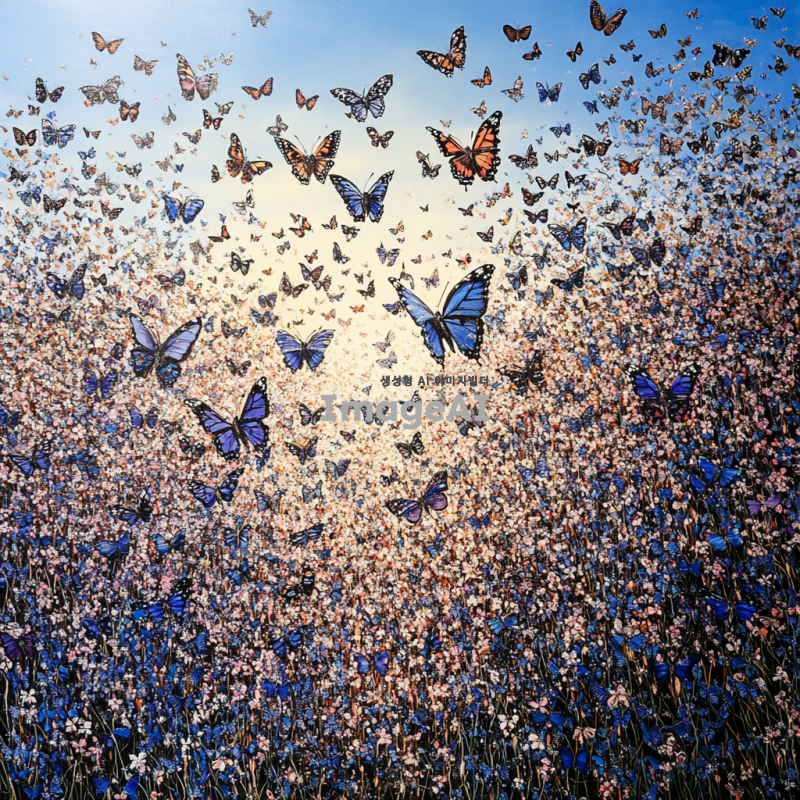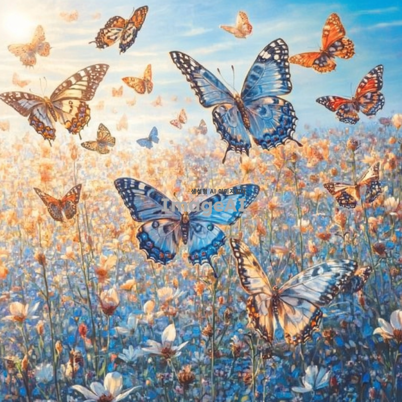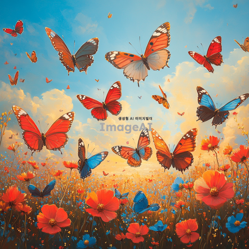 따뜻한 봄날, 꽃밭 위를 날아다니는 다양한 색상의 나비들, 부드럽게 흔들리는 꽃잎과 선명한 파란 하늘, 자연의 아름다움과 평화로움을 강조한 장면, 나비의 섬세한 날개 무늬와 빛나는 햇살이 어우러진 모습, 전체적으로 밝고 생동감 있는 분위기.