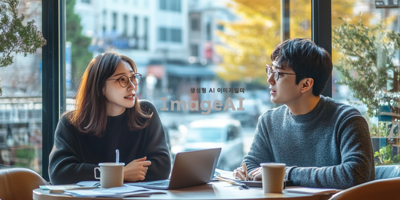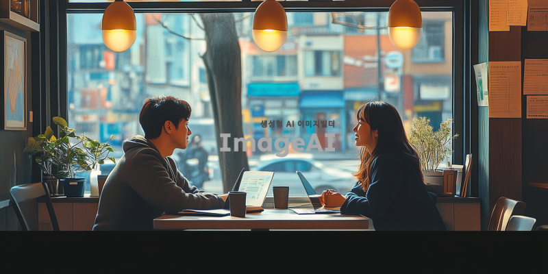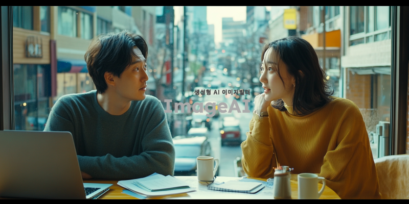 현대적인 카페 내부, 창가에 앉아 대화를 나누고 있는 두 명의 한국인. A는 약간 피곤한 표정으로 테이블에 팔꿈치를 올리고 있으며, B는 놀란 표정으로 A를 바라보고 있다. 주변에는 커피잔과 노트북, 노트 등이 놓여 있어 바쁜 일상과 업무의 분위기를 연출. 창문 밖으로는 바쁜 도시의 거리 풍경이 보이며, 따뜻한 조명 아래 카페의 아늑한 분위기가 느껴진다.