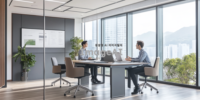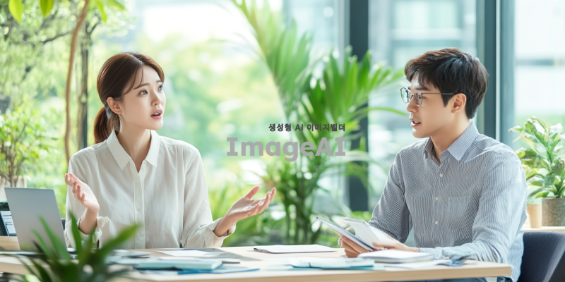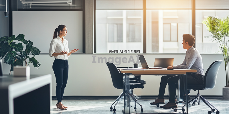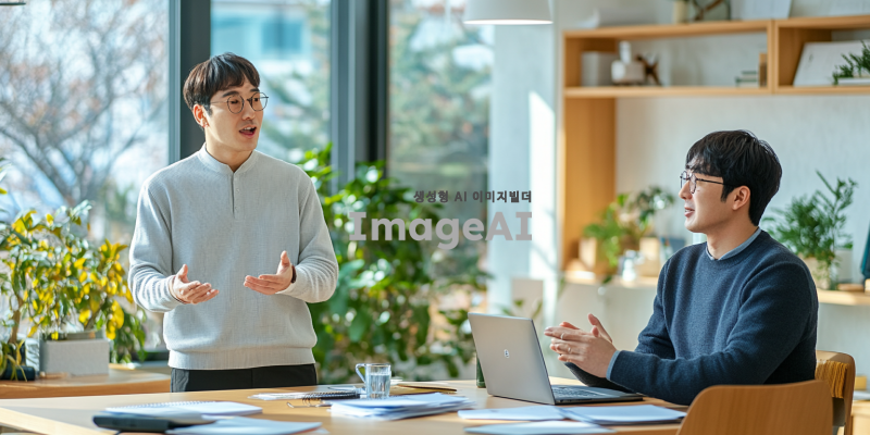 현대적인 사무실의 회의실 내부, 깔끔하고 정돈된 테이블과 의자, 창문을 통해 자연광이 들어오는 밝은 분위기. 두 명의 한국인 직원이 대화를 나누고 있다. 한 명은 테이블 앞에 서서 약간 긴장된 표정으로 말하고 있고, 다른 한 명은 편안하게 의자에 앉아 여유로운 표정으로 대화에 응하고 있다. 두 사람 모두 비즈니스 캐주얼 복장을 하고 있으며, 주변에는 서류와 노트북이 놓여 있다. 대화의 긴장감과 여유로움이 동시에 느껴지는 장면.