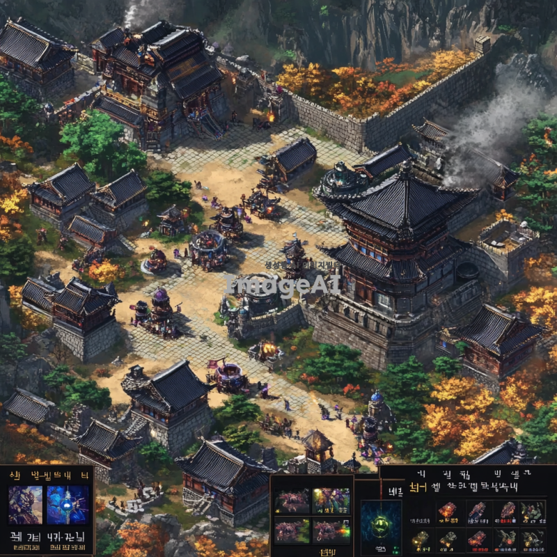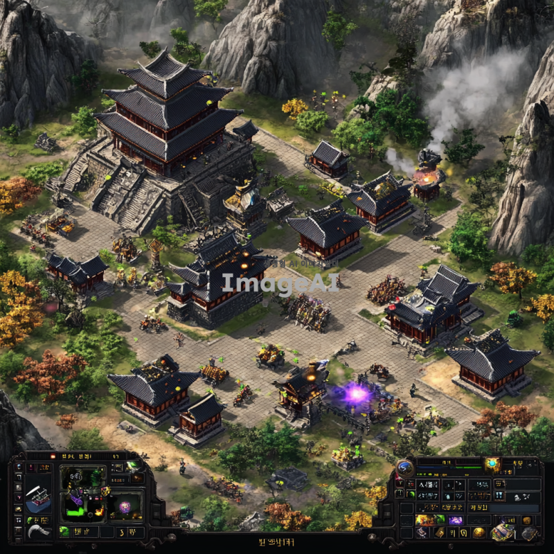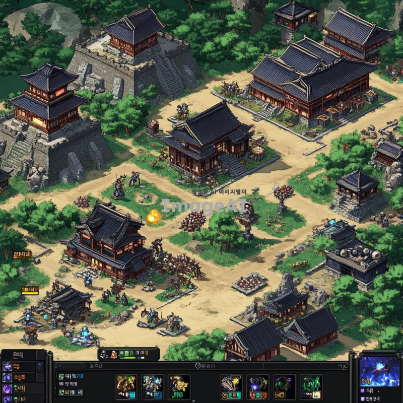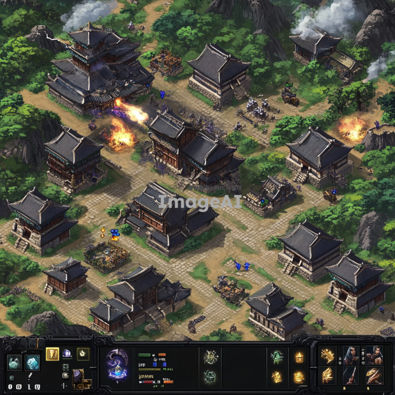 남한산성과 그 외곽을 배경으로 한 전략 게임 맵을 디자인. 고대 한국의 건축 양식을 반영한 성곽과 탑, 전통적인 기와집이 어우러진 풍경. 산성 주변에는 울창한 숲과 계곡이 펼쳐져 있으며, 곳곳에 전설적인 영웅들이 등장할 수 있는 장소가 배치되어 있음. 맵의 각 구역은 다양한 전략적 요소를 포함하고 있어 플레이어가 다양한 전술을 펼칠 수 있도록 설계. 배경에는 자연스러운 하늘과 날씨 효과를 추가하여 현실감을 더함.
