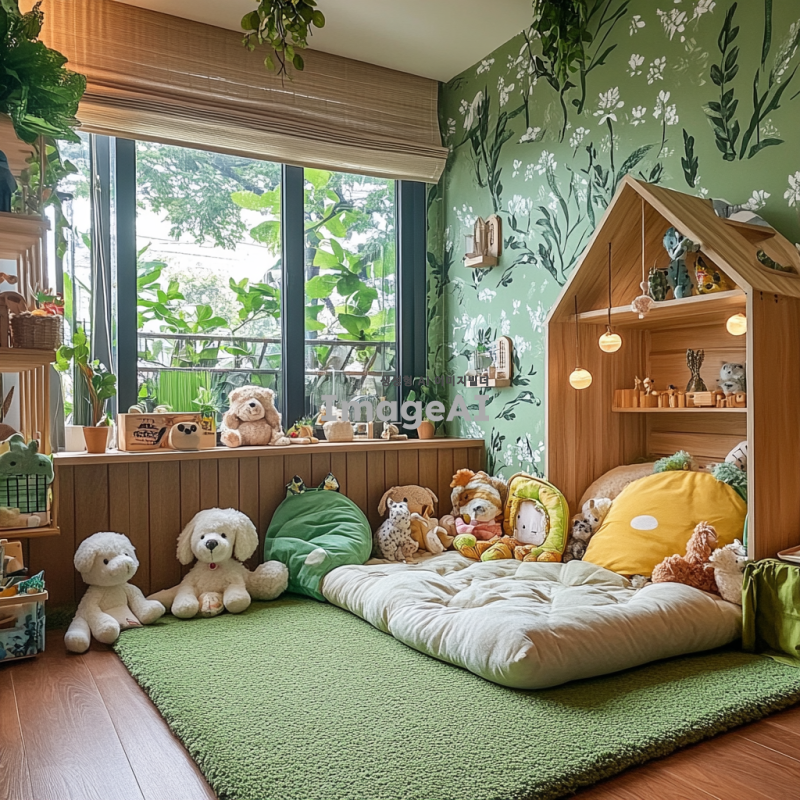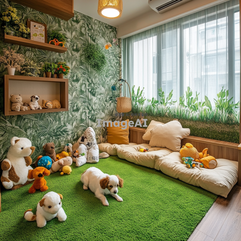 강아지가 편안하게 쉴 수 있는 자연 모티브의 인테리어 디자인, 그린 톤의 벽지와 식물 장식, 나무 소재의 가구로 꾸며진 방, 바닥에는 부드러운 녹색 카펫이 깔려있고, 강아지가 가지고 놀 수 있는 다양한 인형 장난감이 놓여있는 깔끔하고 아늑한 공간, 창문을 통해 자연광이 들어오는 따뜻한 분위기.