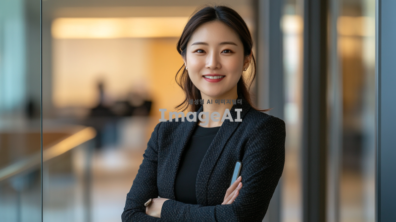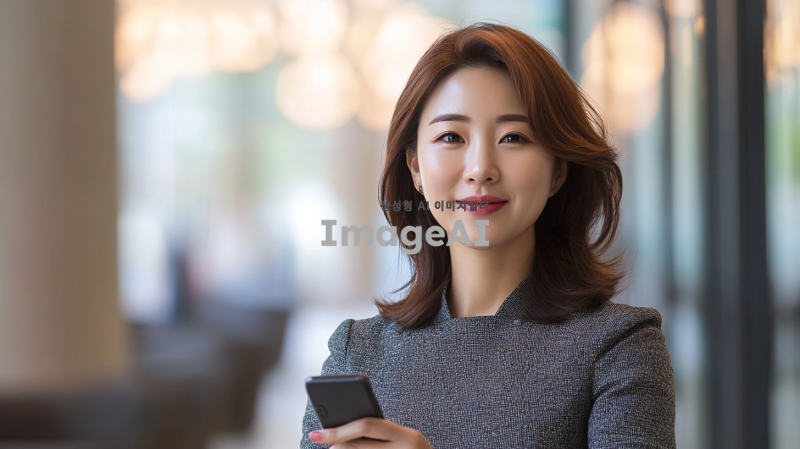 밝고 친절한 표정의 한국 여성, 휴대폰을 손에 들고 있는 모습, 깔끔한 비즈니스 캐주얼 복장, 부드러운 조명 아래에서 촬영된 듯한 느낌, 배경은 심플하고 전문적인 분위기의 오피스 환경, 신뢰감을 주는 따뜻한 색조.