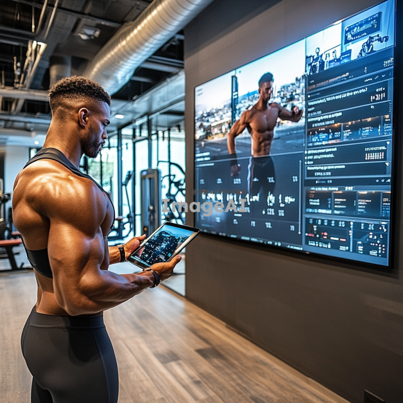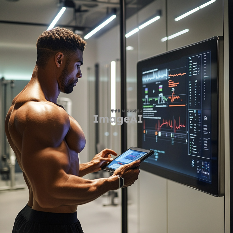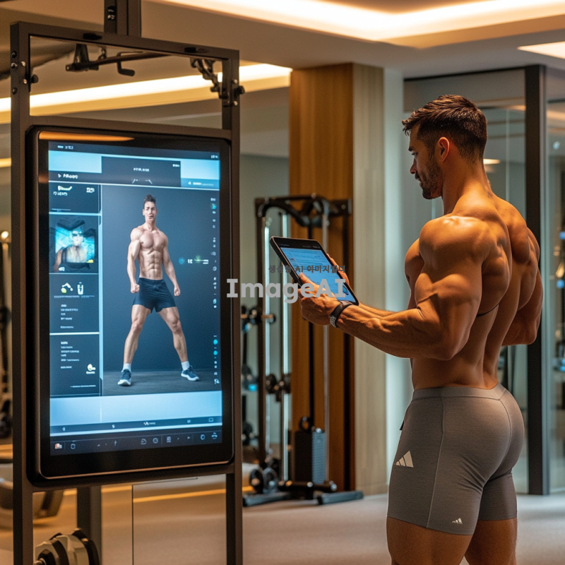 현대적인 헬스장 내부, 최첨단 장비와 AI 코치 시스템이 강조된 모습, 남성이 태블릿을 사용하여 개인 트레이닝 세션을 받고 있는 장면, 벽에는 대형 스크린이 있어 실시간 피드백을 제공하는 모습, 깔끔하고 세련된 인테리어, 밝고 환한 조명, 운동복을 입은 남성의 근육이 잘 드러나도록 표현, 디지털 기술과 피트니스의 융합이 돋보이는 장면, 스마트폰과 태블릿을 활용한 헬스케어의 미래적 이미지.
