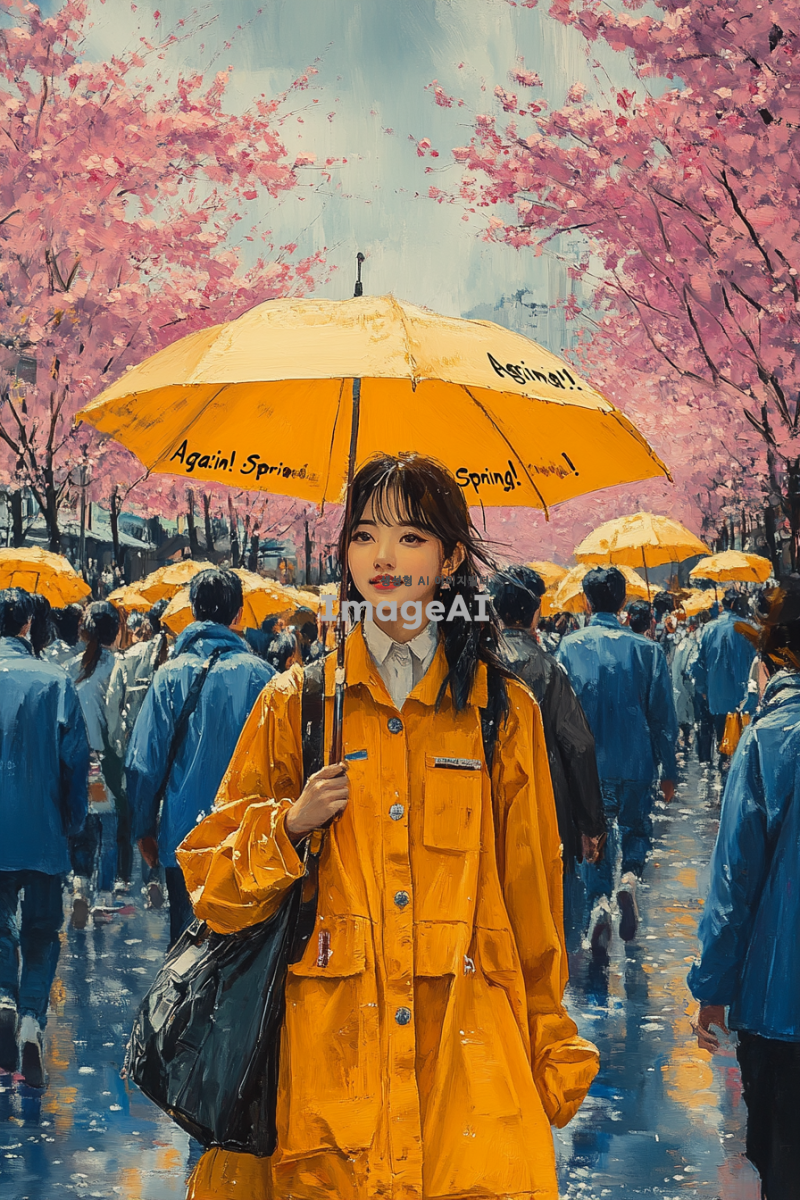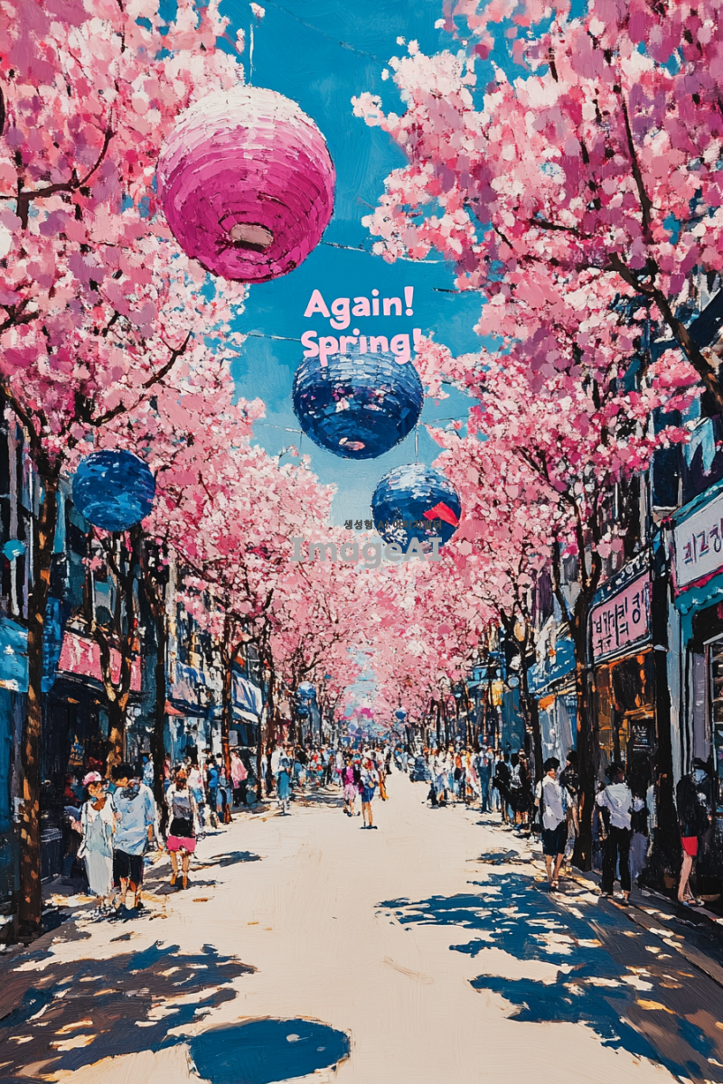 안산국제거리극축제의 활기찬 분위기를 담은 거리 예술가들이 공연하는 모습, 다양한 색상의 화려한 거리와 축제의 에너지를 표현. "다시! 봄!"이라는 슬로건을 강조하여 포스터 중앙에 배치, 봄의 생동감과 새로움을 상징하는 요소들, 예를 들어 꽃, 나무, 밝은 햇살 등을 배경에 포함. 한국 전통 예술과 현대적 감각이 조화를 이루는 디자인, 다양한 연령대의 사람들이 함께 즐기는 모습을 표현하여 모두가 참여할 수 있는 축제의 포용성을 강조.