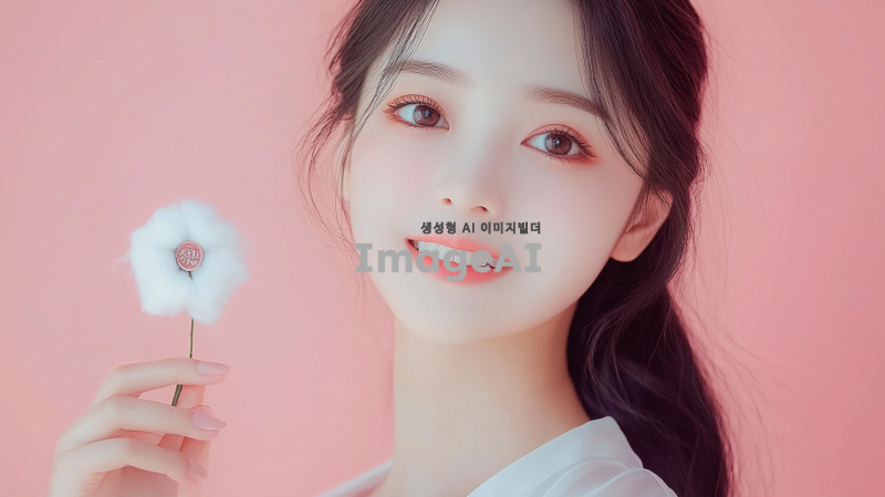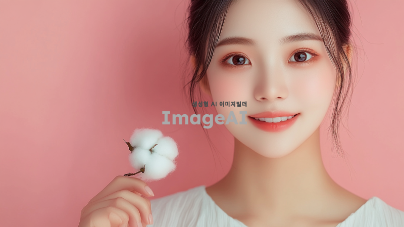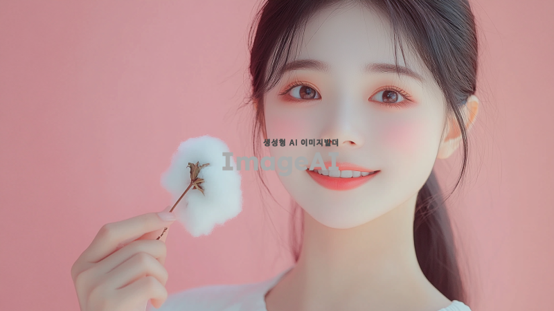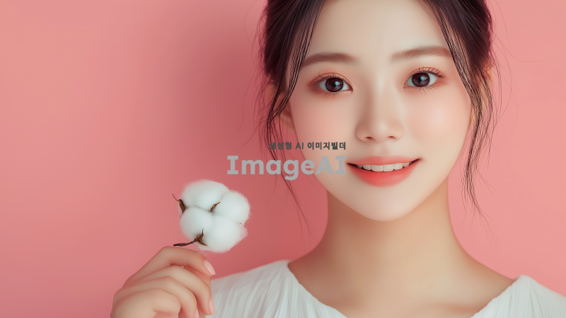 청순한 예쁜 아시아 여성, 미소짓는 모습, 손에 목화꽃 한송이 든 모습, 배경은 분홍색배경, 흰색 쉬폰 소재 , 순수한 느낌 옷