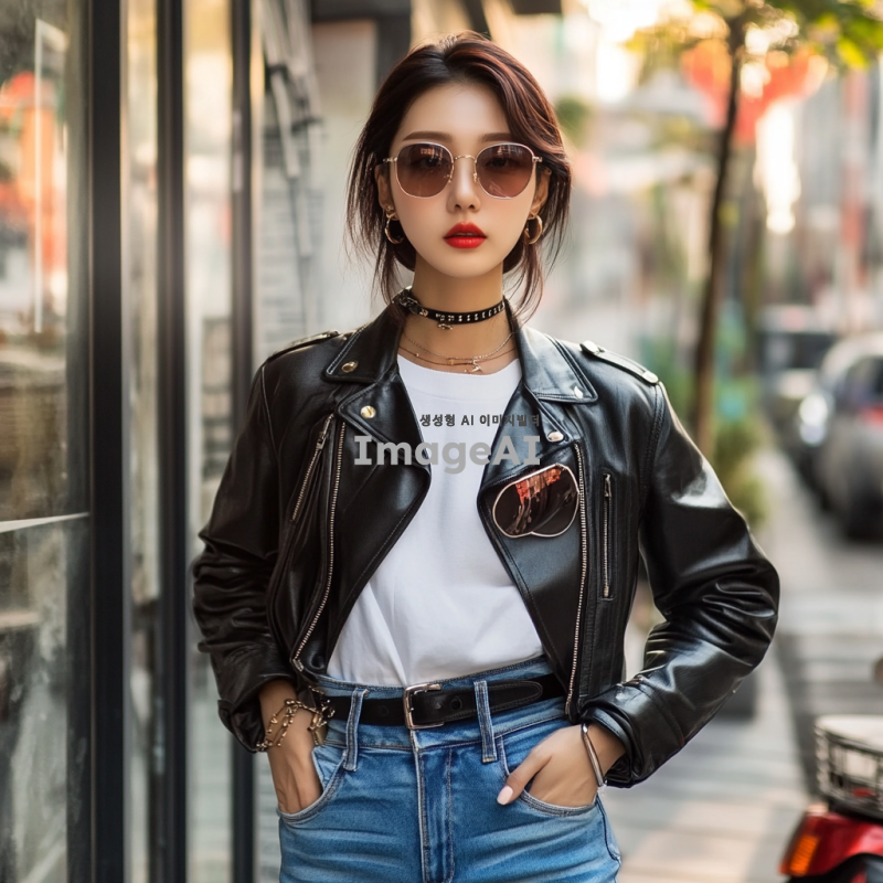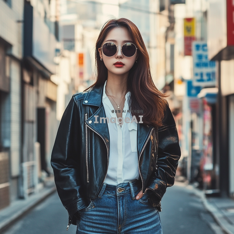 도시 거리에서 포즈를 취하는 세련된 한국 여성, 최신 패션 트렌드를 반영한 스타일리시한 옷차림, 청바지와 화이트 셔츠, 블랙 가죽 재킷, 선글라스를 착용하고 있으며, 배경은 현대적인 도시 풍경, 자연스러운 조명과 함께 활기찬 분위기.