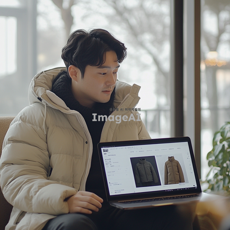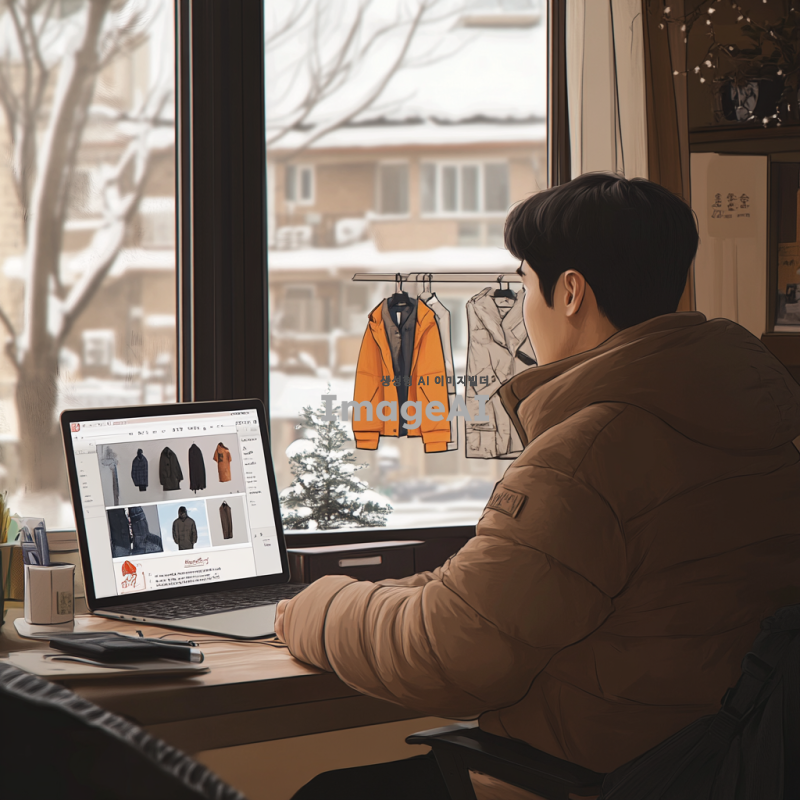 20대 한국 남성이 겨울코트를 구매하기 위해 여러 패션 사이트를 비교하는 장면. 남성은 편안한 옷차림으로 노트북 앞에 앉아 있으며, 화면에는 다양한 스타일의 겨울코트 이미지가 표시되어 있다. 방 안은 따뜻하고 현대적인 분위기로 꾸며져 있으며, 창밖으로는 겨울 풍경이 보인다. 남성은 집중한 표정으로 화면을 바라보고 있다.