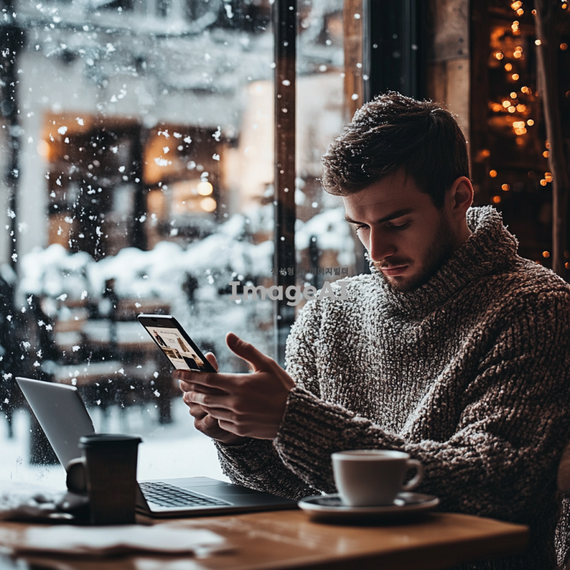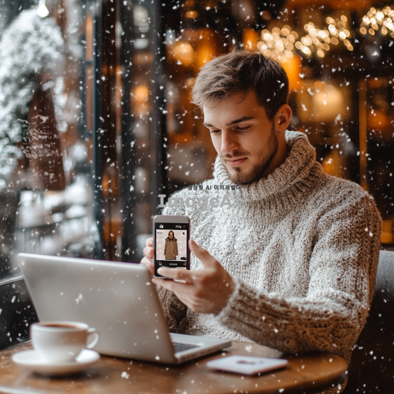 젊은 남자가 스마트폰을 들고 패션 어플리케이션을 탐색하며 겨울 코트를 비교하는 장면. 그는 따뜻한 카페 안에 앉아 있으며, 창밖으로 눈이 내리는 겨울 풍경이 보인다. 남자는 캐주얼한 니트 스웨터를 입고 있으며, 테이블 위에는 커피잔과 노트북이 놓여 있다. 주변에는 모던한 인테리어와 아늑한 조명이 분위기를 더한다.