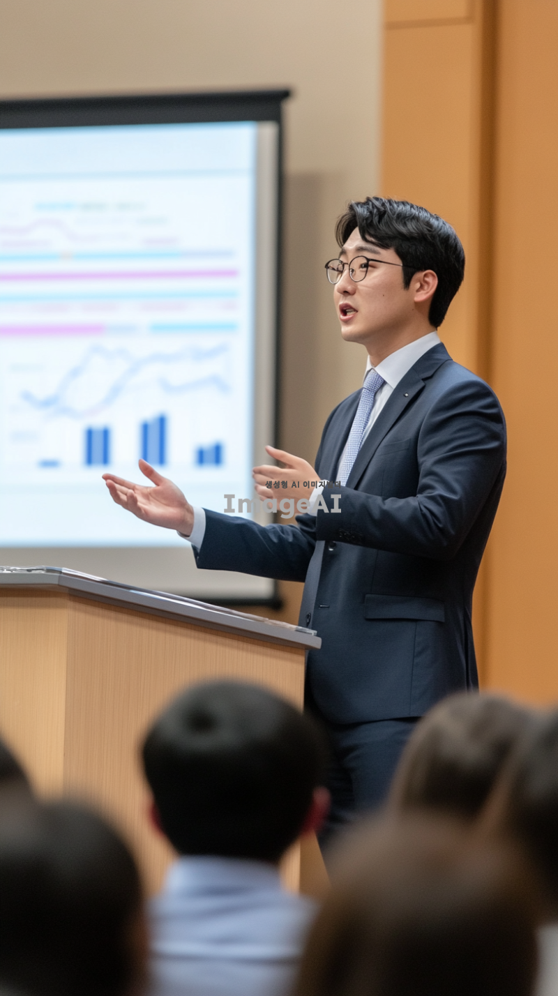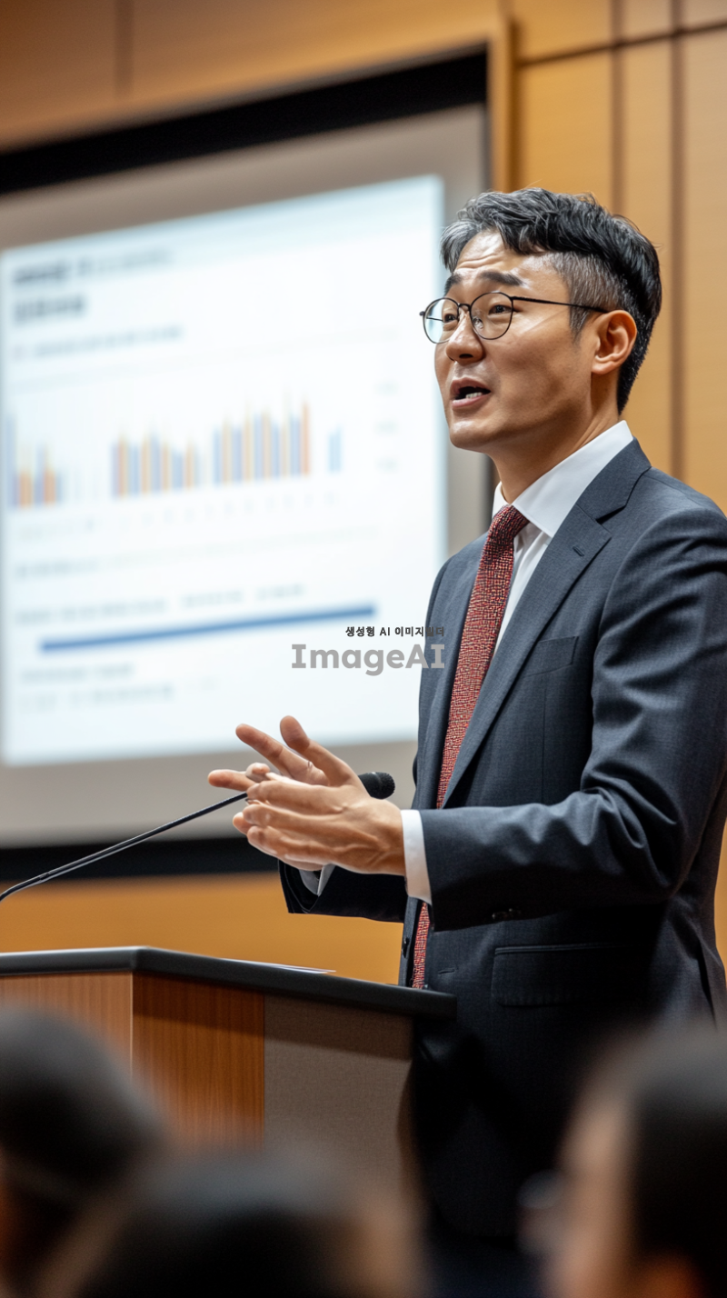 강의실에서 연단에 서서 차트를 보며 고개를 좌우로 흔들며 반대의견을 표하는 한국인 연설자, 비즈니스 정장 차림, 강의실 배경, 차트는 그래프 형태로 화면에 표시, 청중은 흐릿하게 표현.