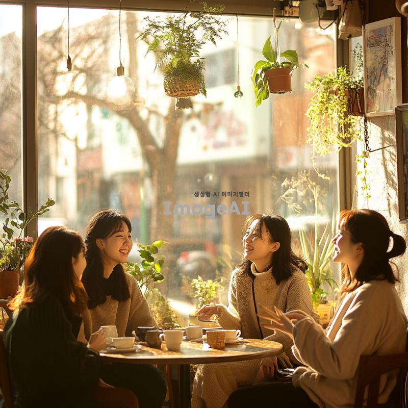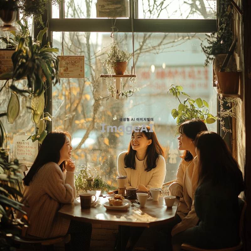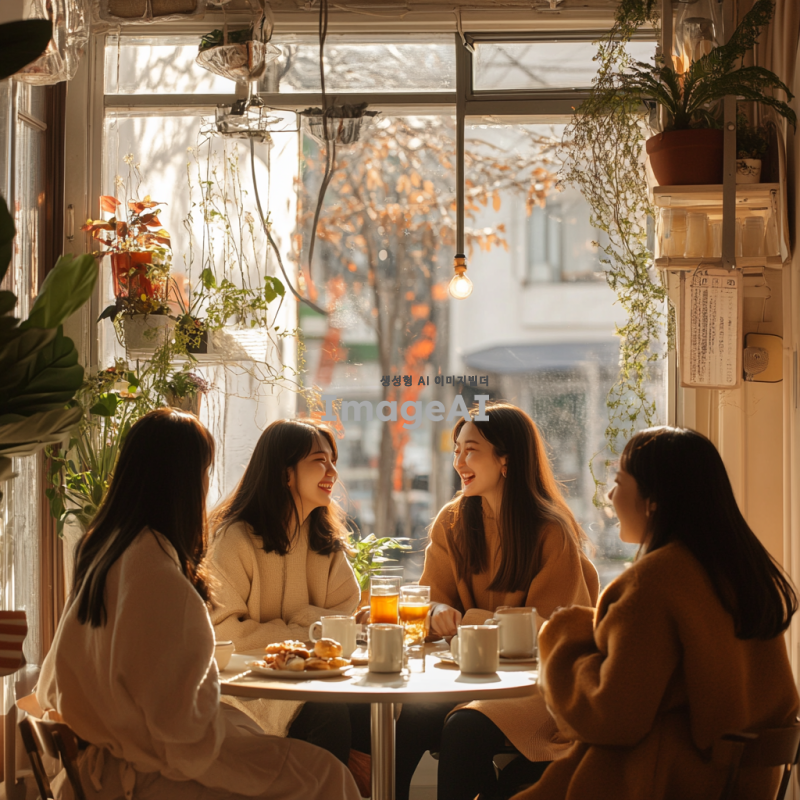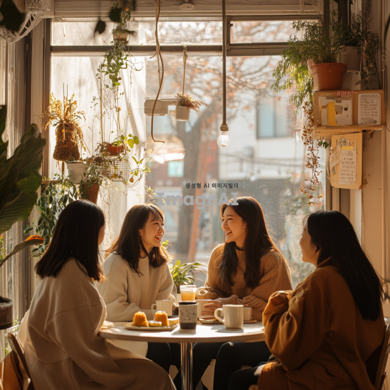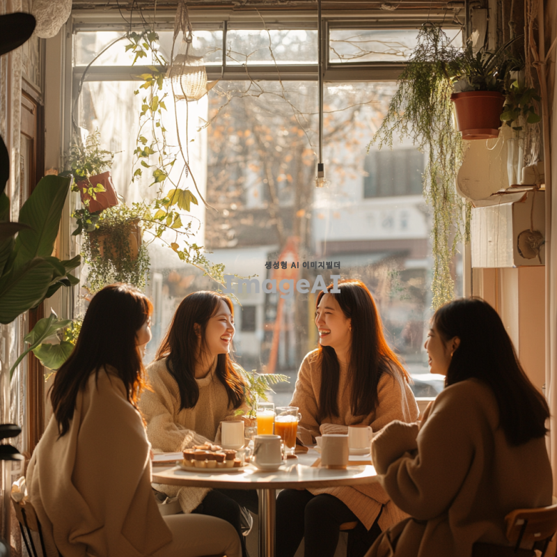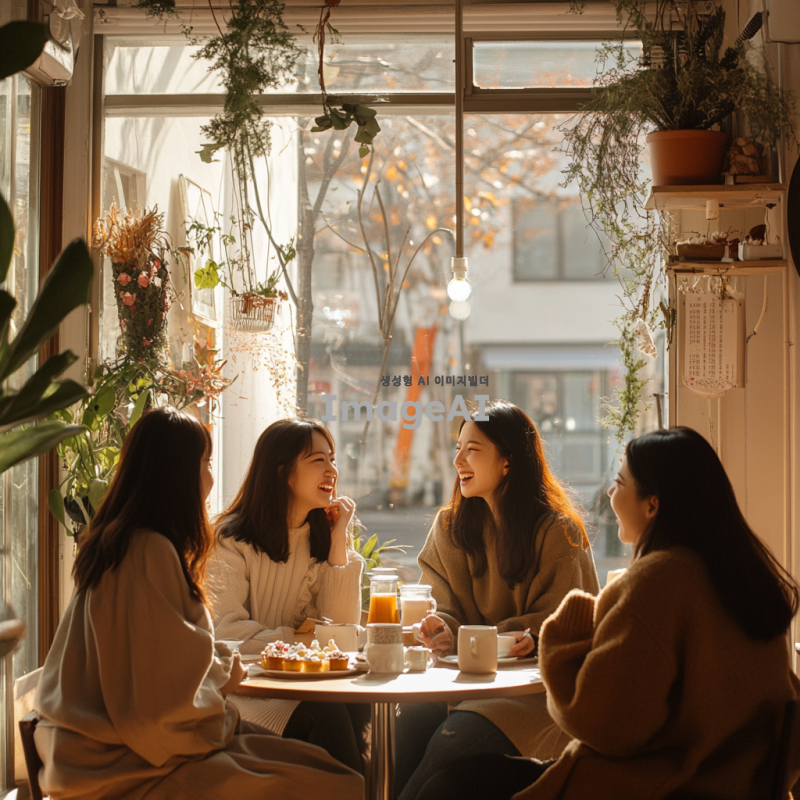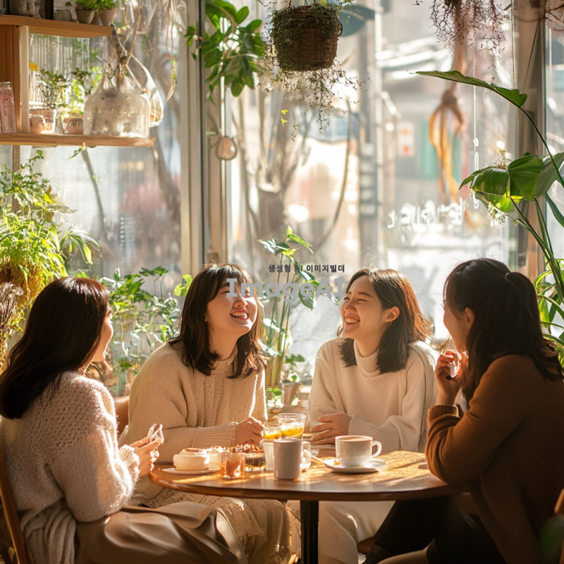 따뜻하고 아늑한 분위기의 카페 내부, 창문으로 부드러운 햇살이 들어오는 장면. 테이블에 앉아 있는 다섯 명의 한국인 여성들이 서로를 바라보며 웃고 있다. 각자의 스타일이 돋보이는 캐주얼한 옷차림을 하고 있으며, 테이블 위에는 커피잔과 디저트가 놓여 있다. 주변에는 식물과 아기자기한 장식들이 배치되어 있어 편안한 느낌을 준다. 자연스러운 표정과 포즈로 서로 대화하는 모습.