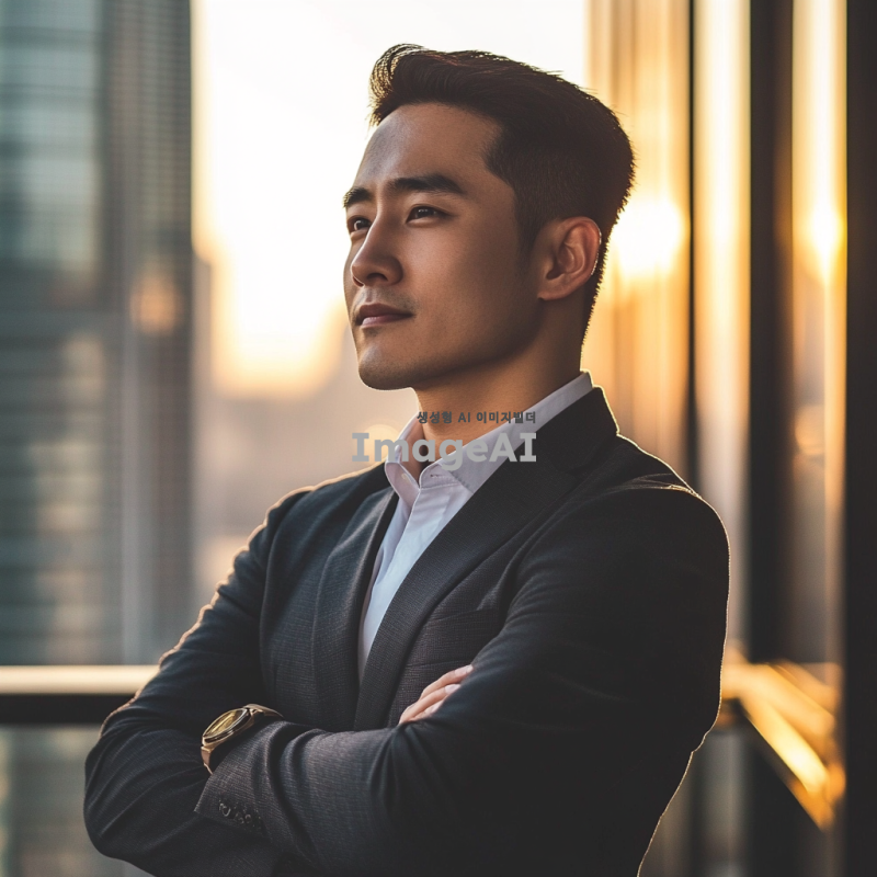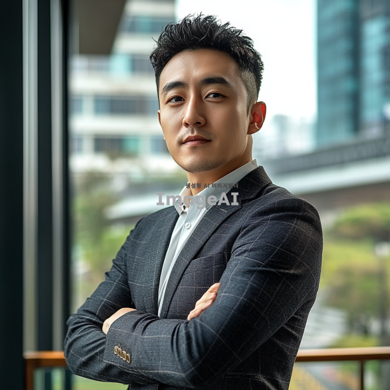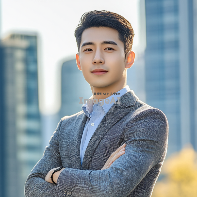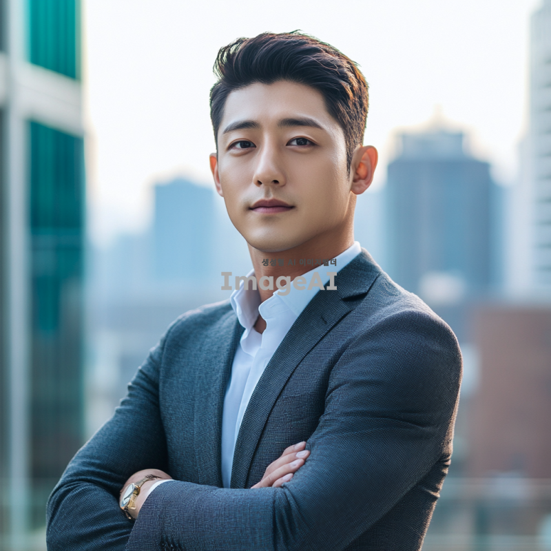 짧은 머리를 한 건장하고 스마트한 이미지의 한국 남성이 팔짱을 끼고 서 있는 모습. 남성은 세련된 캐주얼 정장을 입고 있으며, 배경은 현대적인 도시 풍경으로 설정. 남성의 표정은 자신감 있고 친근하며, 주변 조명은 자연스러운 햇빛이 비치는 느낌으로 연출.