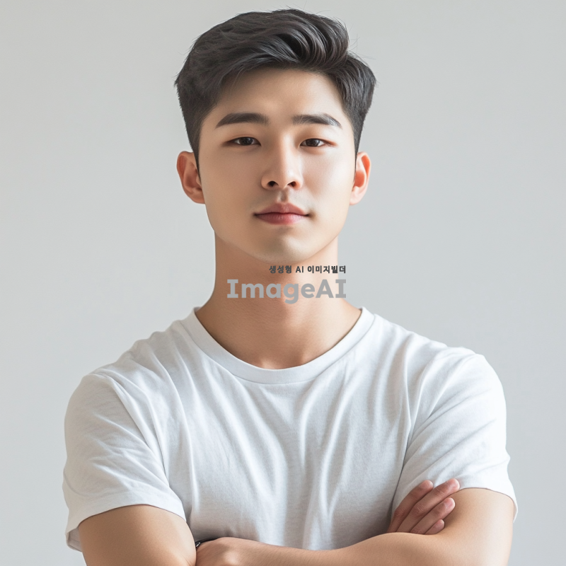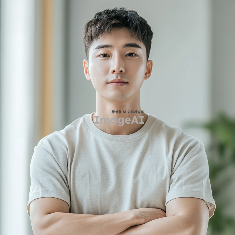건장하고 믿음직스러운 이미지의 짧은 머리를 가진 한국 남성이 팔짱을 끼고 서 있는 모습, 반팔 티셔츠를 입고 있으며, 배경은 부드러운 색조의 단순한 디자인으로 설정. 남성의 표정은 자신감 있고 친근한 느낌을 주며, 자연스러운 조명 아래에서 촬영된 듯한 분위기.