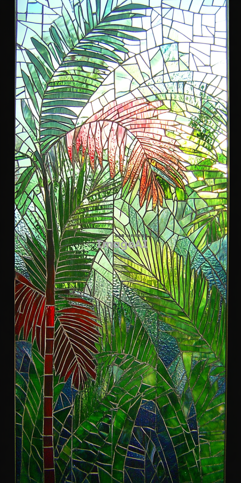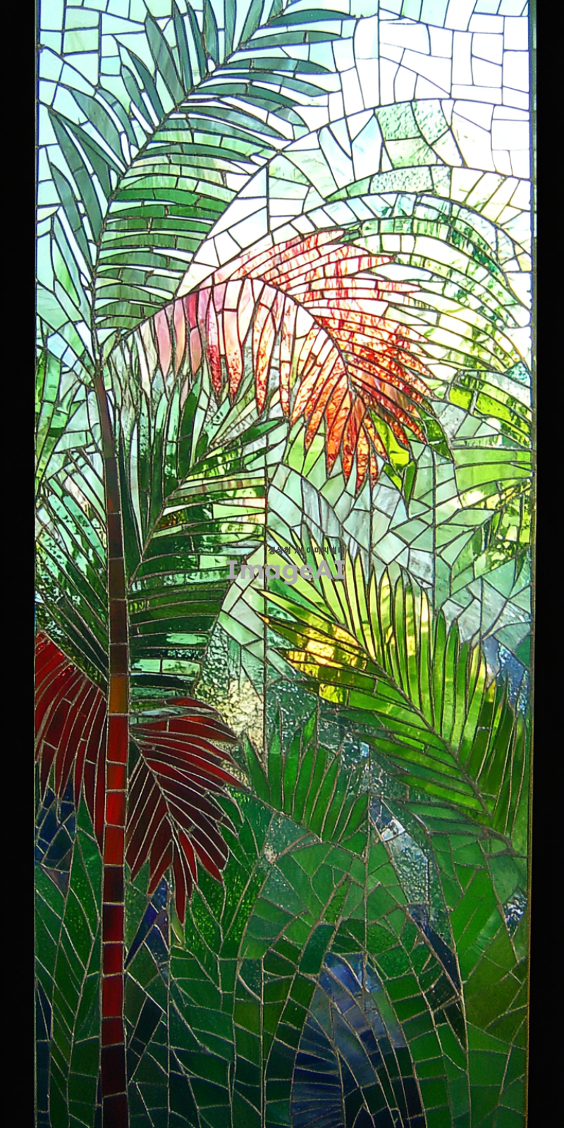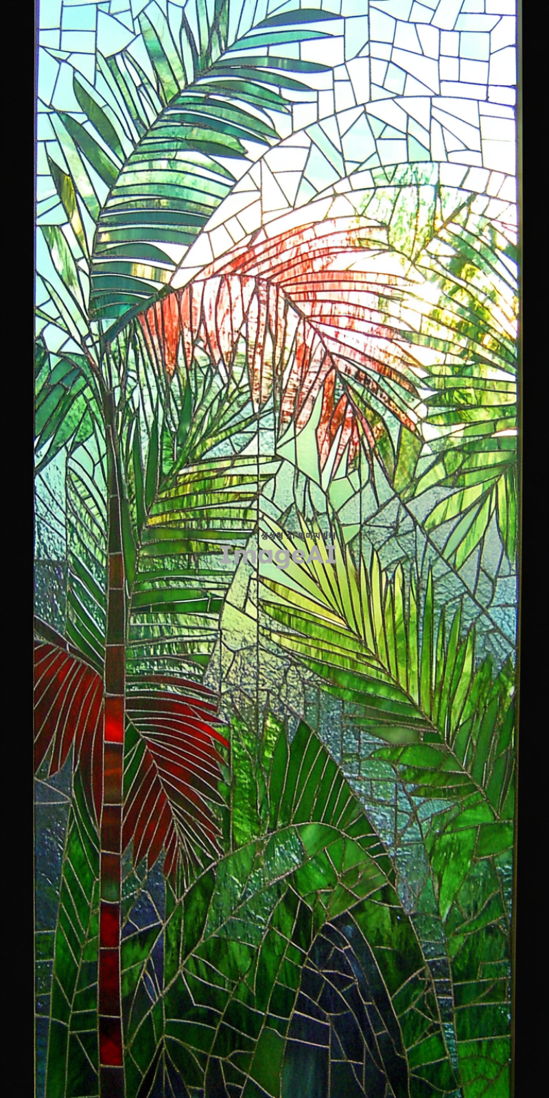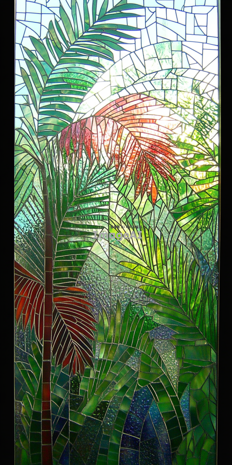 팔마 가지를 현대적으로 해석한 스태인드글라스, 기하학적 문양, 색상은 팔마 가지는 녹색 푸른색과 붉은색 배경으로 하고 아래는 진하게 위로 갈수록 연하게 그라데이션, 햇빛이 비출 때 빛과 그림자가 아름답게 어우러지는 모습, 선은 굵게, 섬세한 디테일과 화려한 색감이 돋보이는 디자인, 고풍스러운 느낌과 현대적인 감각이 공존하는 작품