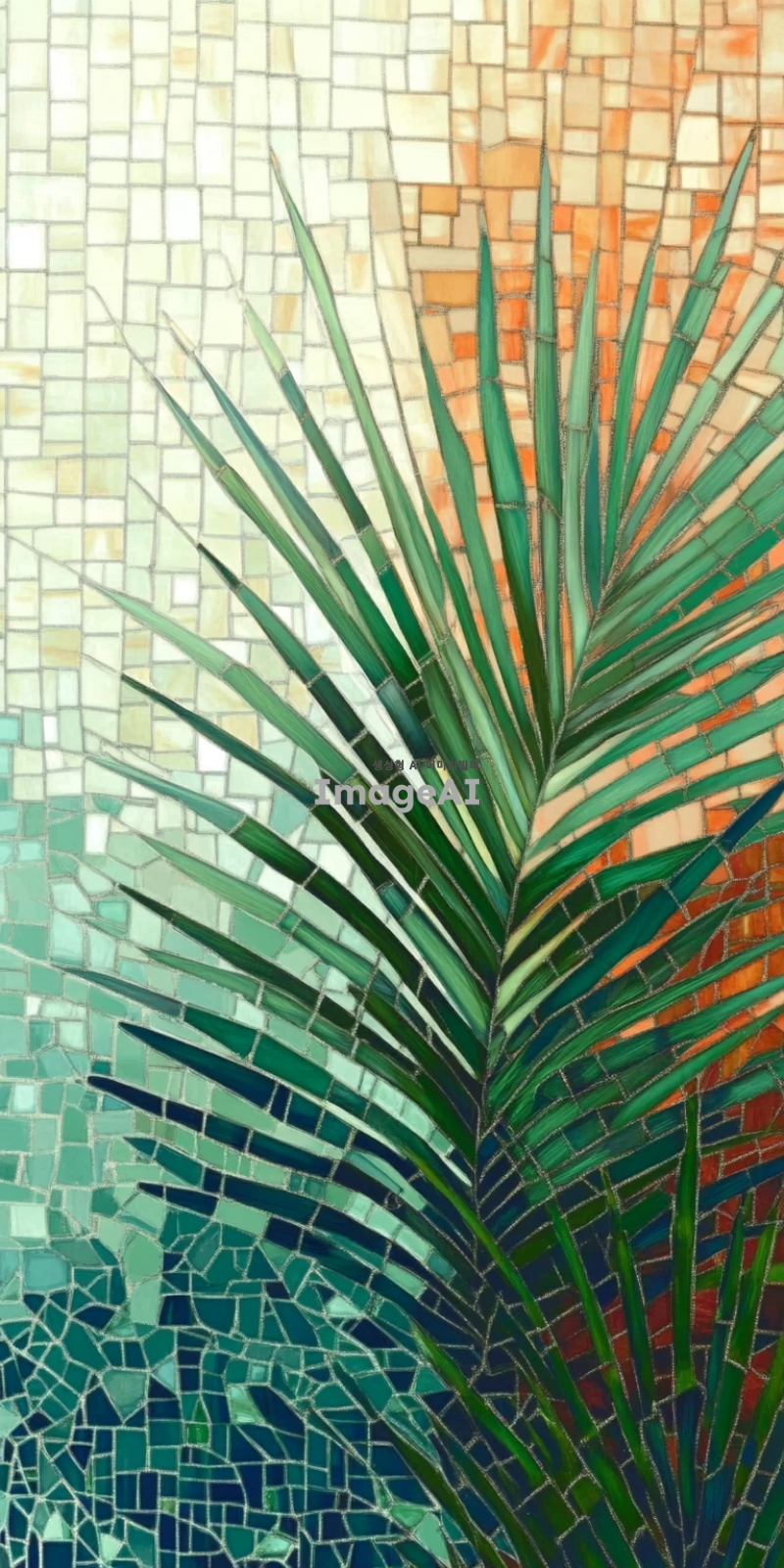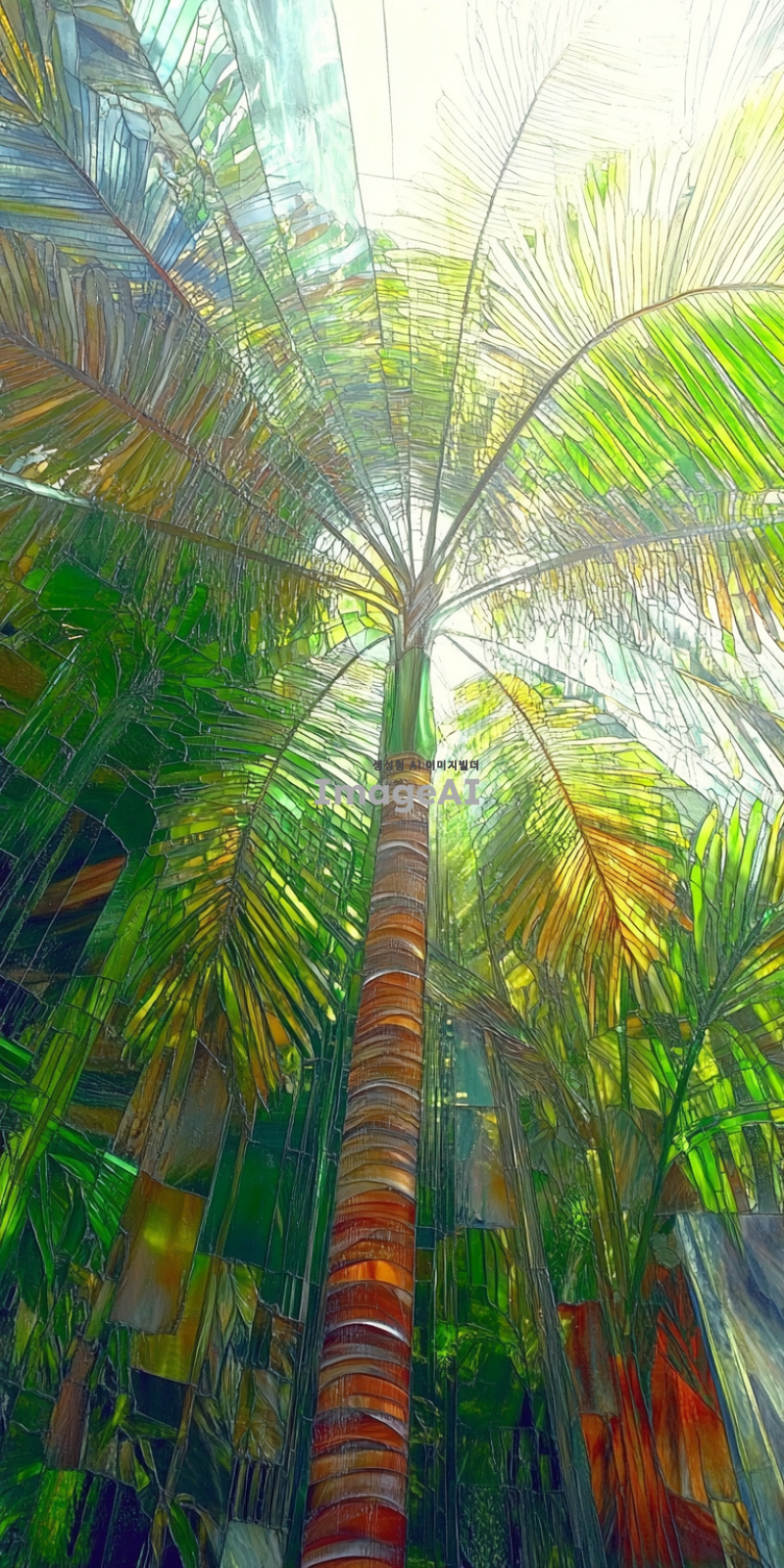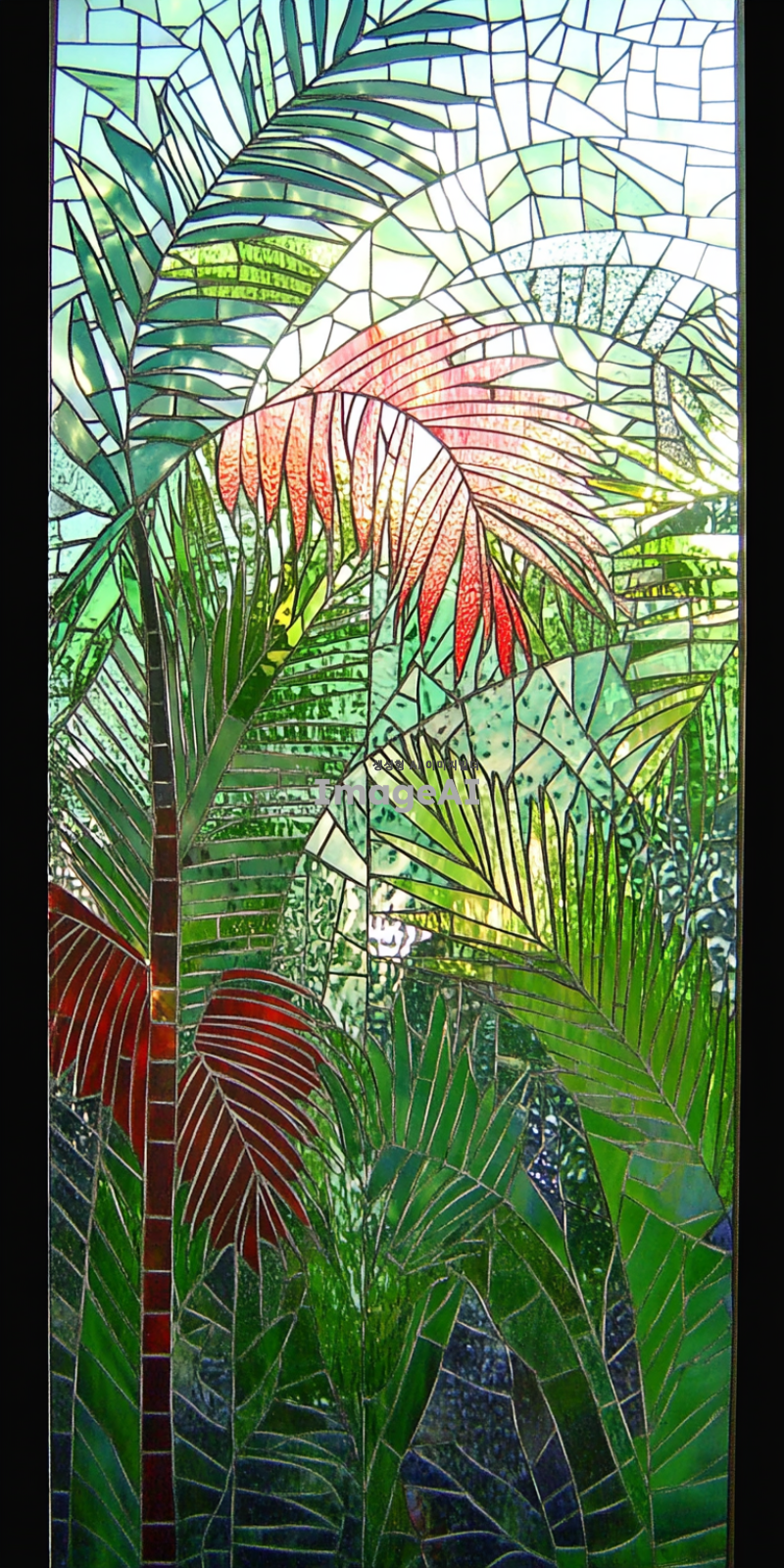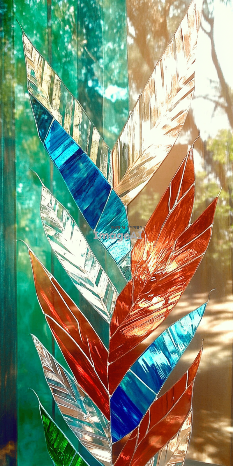 팔마 가지를 현대적으로 해석한 스태인드글라스, 기하학적 문양, 색상은 팔마 가지는 녹색 푸른색과 붉은색 배경으로 하고 아래는 진하게 위로 갈수록 연하게 그라데이션, 햇빛이 비출 때 빛과 그림자가 아름답게 어우러지는 모습, 선은 굵게, 섬세한 디테일과 화려한 색감이 돋보이는 디자인, 고풍스러운 느낌과 현대적인 감각이 공존하는 작품