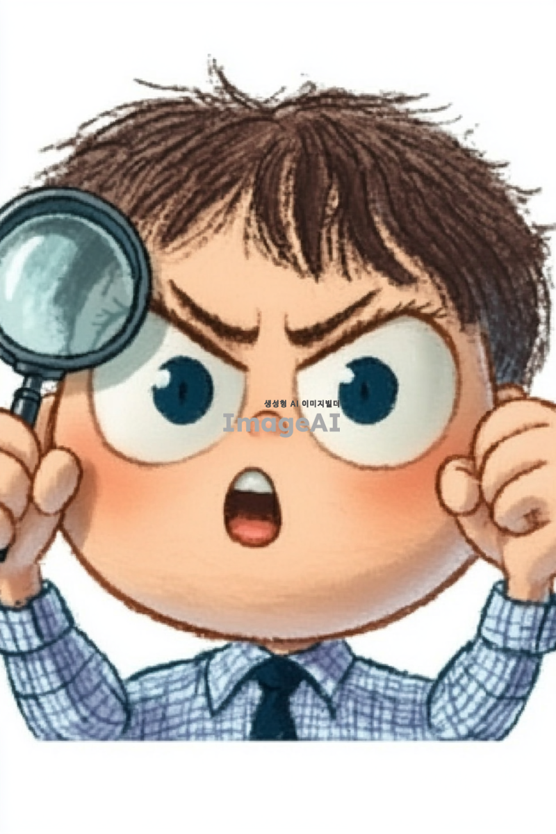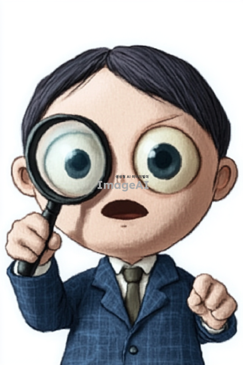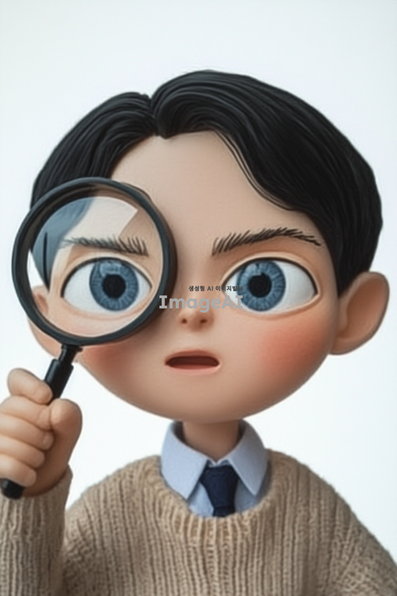 흰색 배경에 자기 얼굴의 10배 큰 돋보기를 한 쪽 눈에 대고 화면 밖을 바라보고 있는 눈이 작은 학생 캐릭터