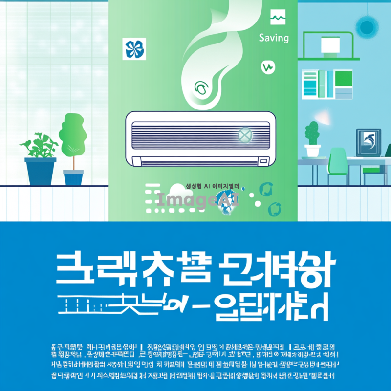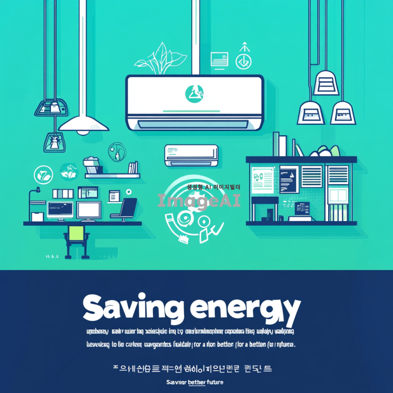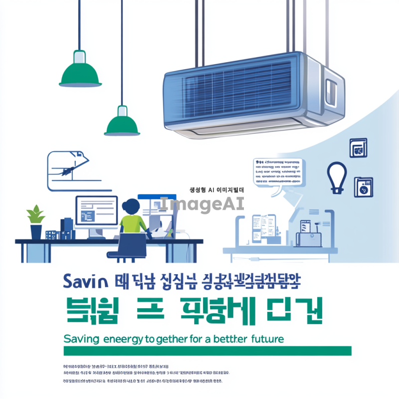 한국의 사무실 환경을 배경으로, 냉난방기 사용 금지를 알리는 포스터 디자인. 시원한 색상의 배경에 에너지를 절약하자는 메시지를 강조하는 텍스트를 추가. 냉난방기의 이미지를 중앙에 배치하고, 그 위에 금지 표식을 강조하여 그려냄. 친환경적인 느낌을 주기 위해 녹색과 파란색 톤을 사용하고, 직원들이 협력하여 에너지를 절약하는 모습을 작은 아이콘으로 표현. 포스터 하단에 "함께하는 에너지 절약, 더 나은 미래"라는 문구를 추가.
