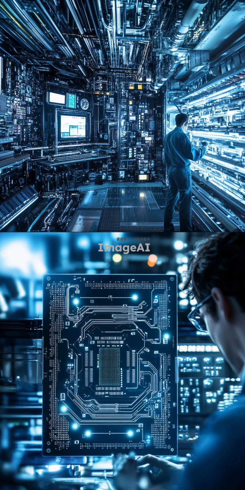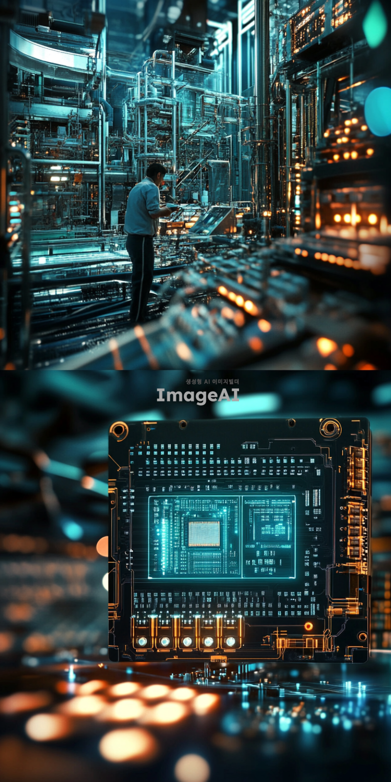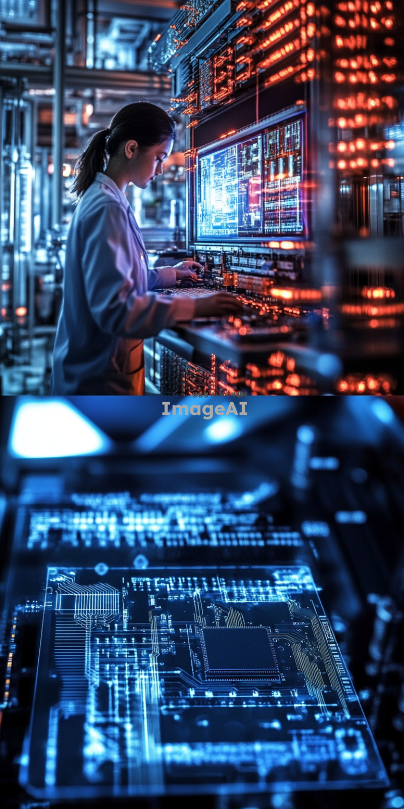 1. 최첨단 반도체 공장 내부, 반짝이는 기계와 복잡한 회로가 가득한 모습, 기술자가 디지털 패널을 조작하는 장면, 미래적인 분위기, 고해상도