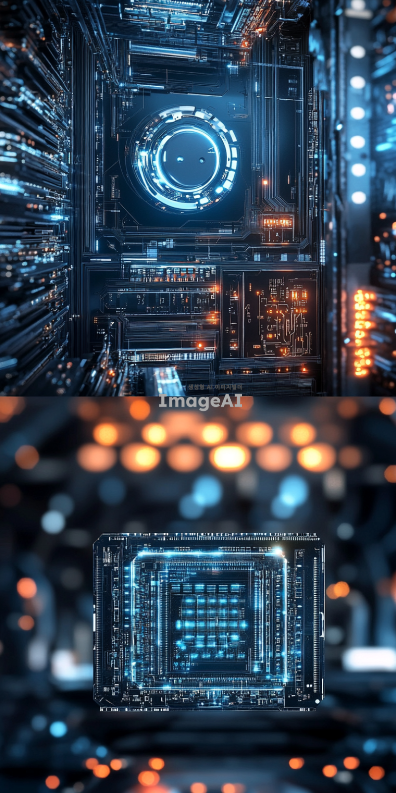 2. 고성능 컴퓨터 칩 클로즈업, 복잡한 회로와 세밀한 디자인이 돋보이는 모습, 빛나는 금속 재질, 첨단 기술을 상징하는 이미지, 고해상도